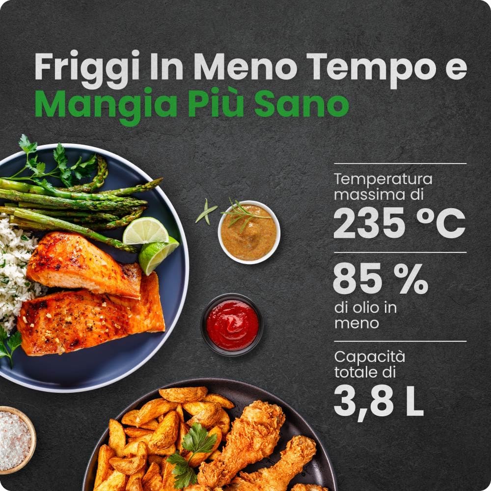 - Hi-Fry Technologie für Extra-Knusprigkeit: Für das perfekte Finish kann die Temperatur in den letzten zwei Minuten auf bis zu 235 °C erhöht werden – ideal für unwiderstehlich knusprige Pommes frites und Poulet.