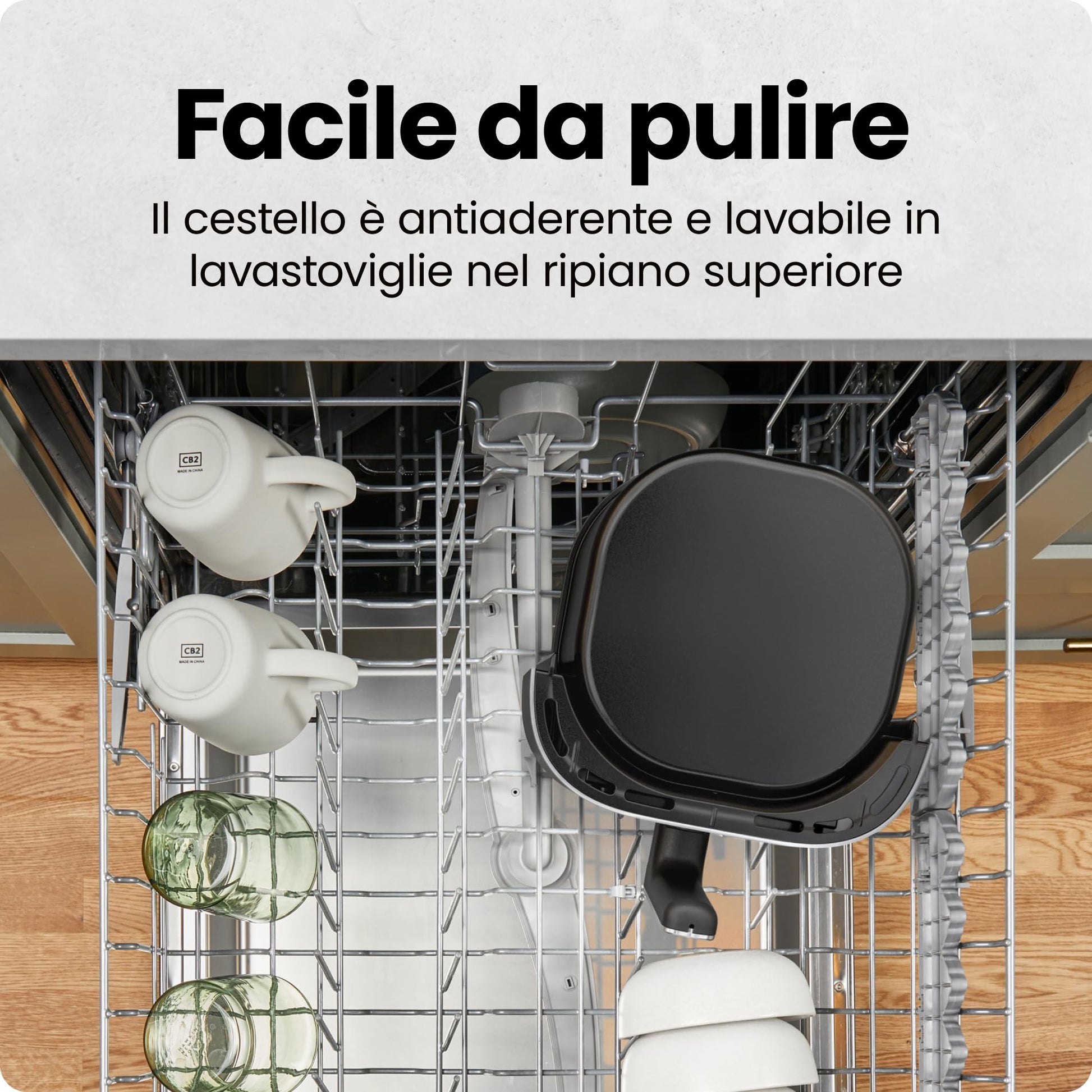 Die Reinigung ist besonders einfach und zeitsparend. Sowohl der antihaftbeschichtete Korb als auch der Grillrost sind komplett spülmaschinenfest, sodass Sie nach dem Kochen mehr Zeit zum Geniessen haben.