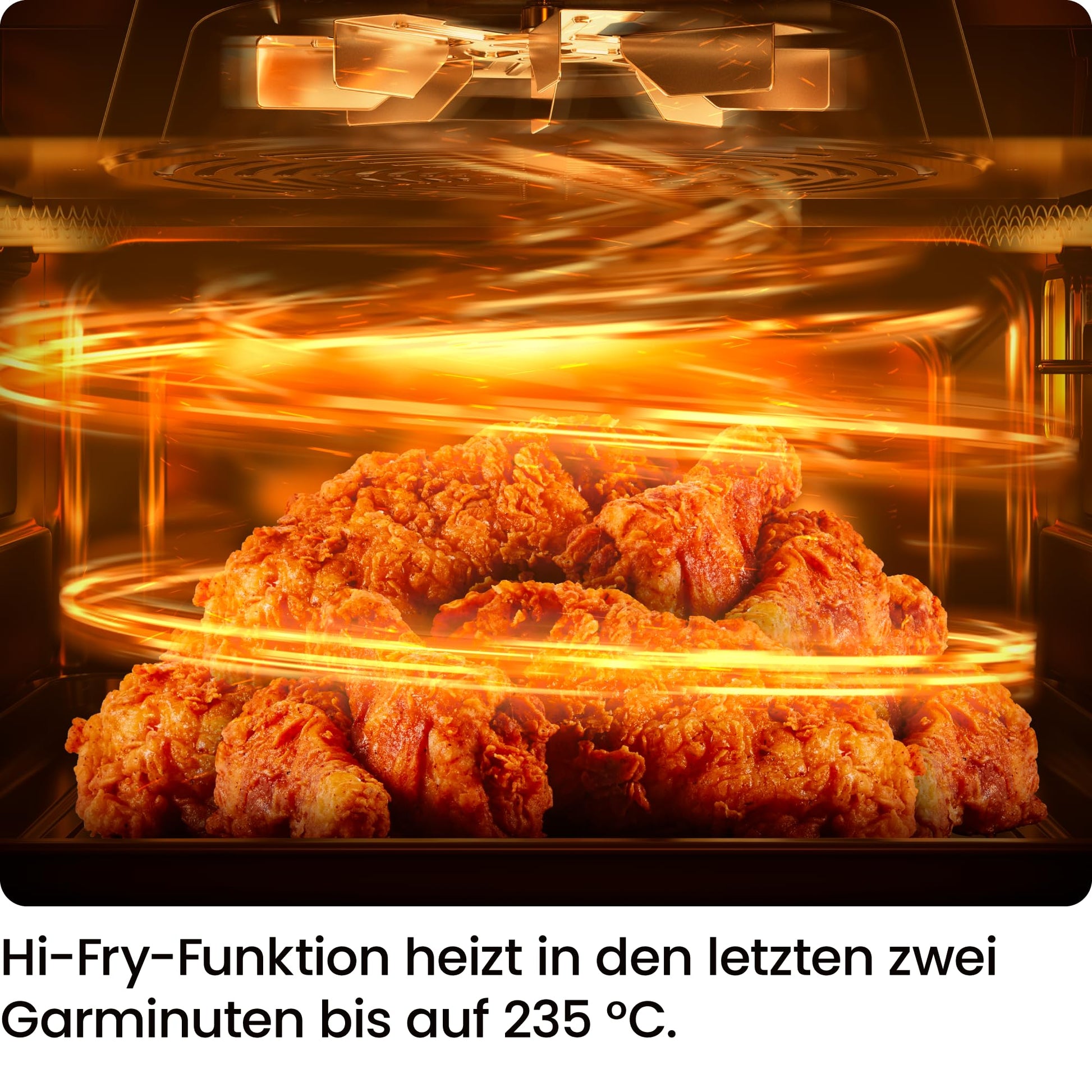 - Hi-Fry Technologie bis 235 °C: Verleihen Sie Ihren Speisen das perfekte knusprige Finish. Eine Hitzestufe von 235 °C in den letzten Minuten sorgt für besonders krosse Pouletschenkel oder Pommes frites.