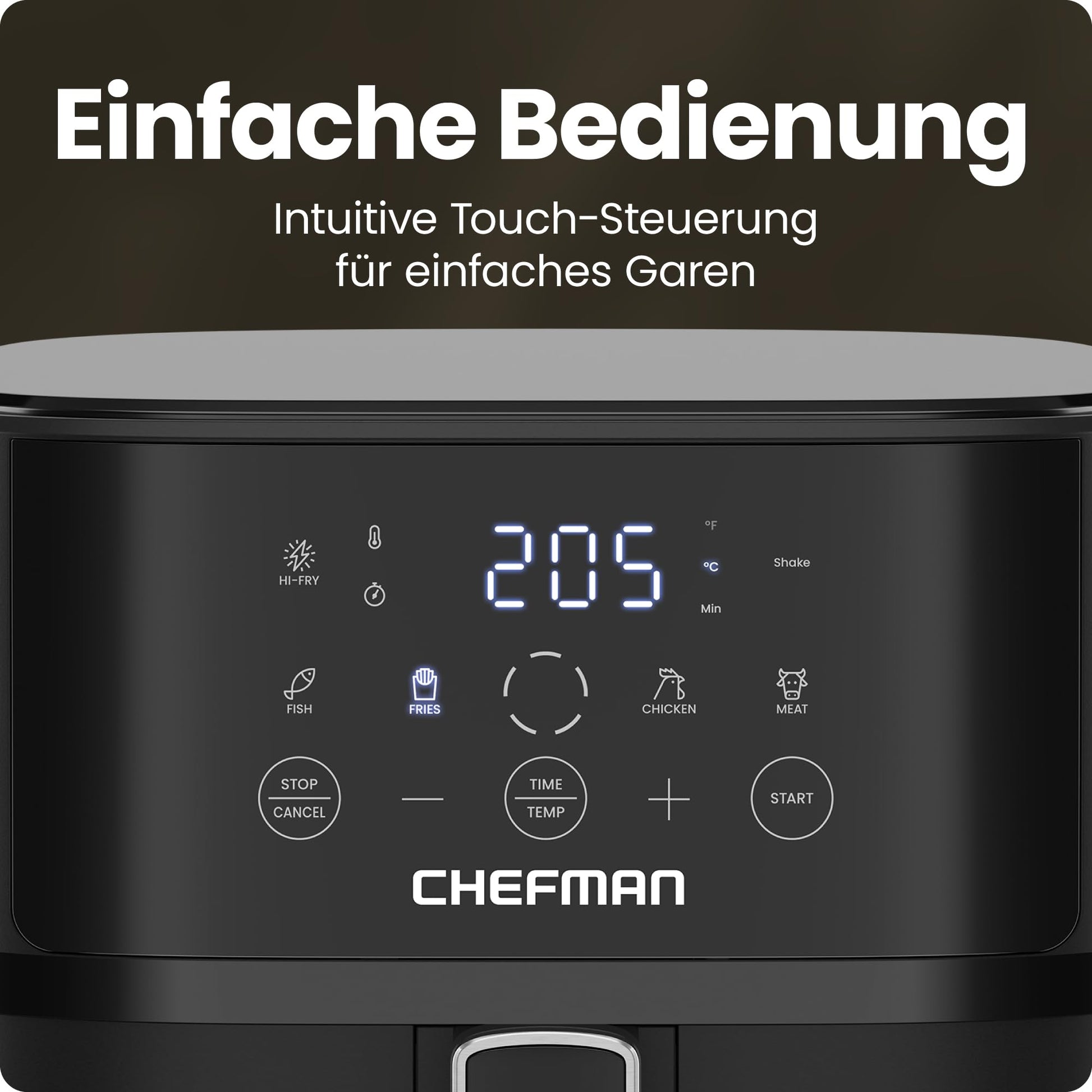Chefman 5,7L Heißluftfritteuse, schnell & einfach, kompakte Heissluftfritteuse mit Hi-Fry Technologie, Touch Controls mit 4 Voreinstellungen, antihaftbeschichtet & spülmaschinenfest - Schwarz