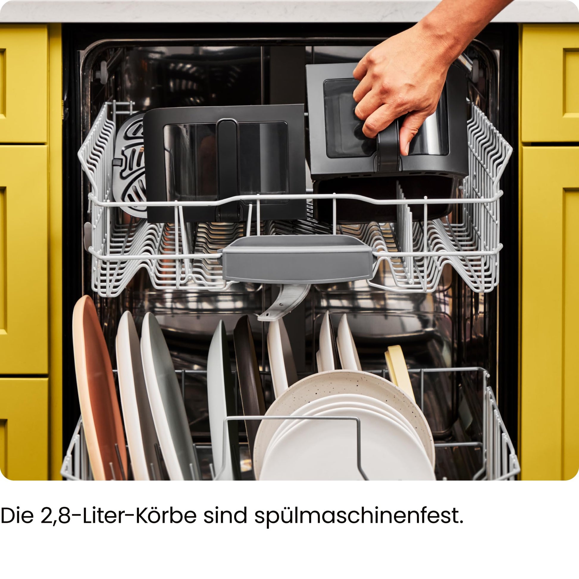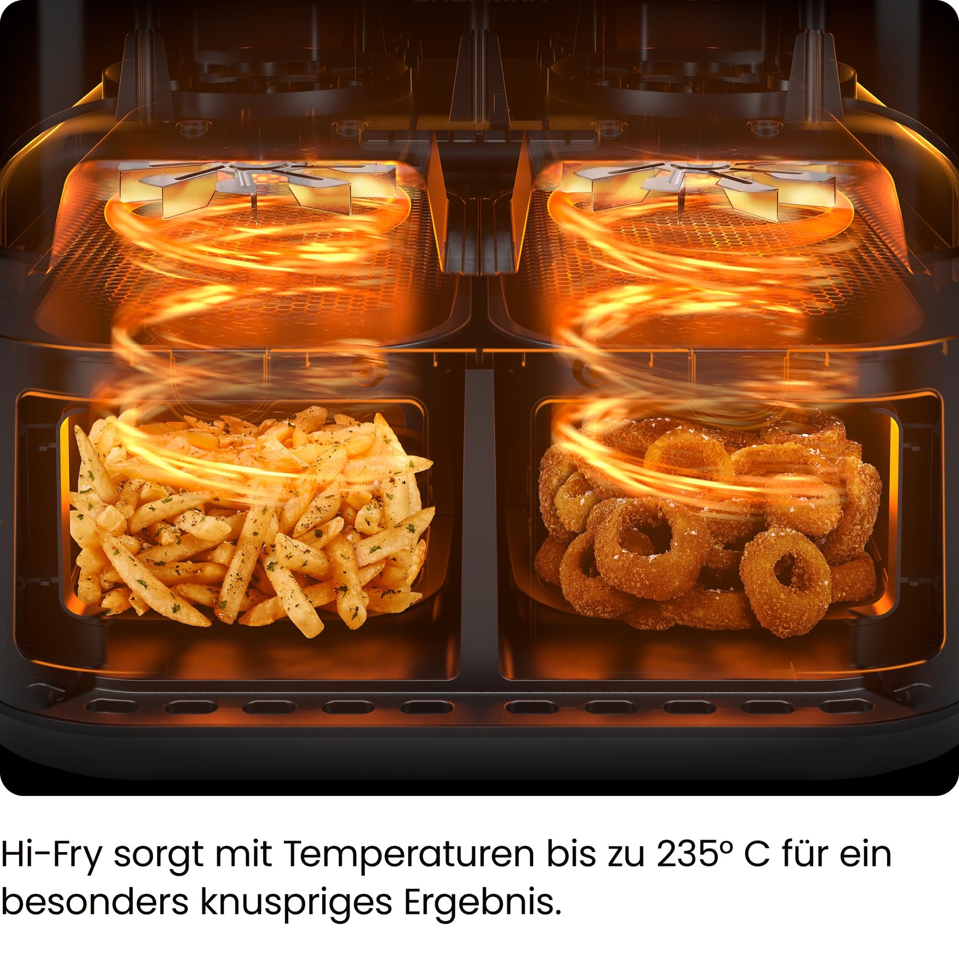 Mit den zwei separaten 2,8-Liter-Körben können Sie ein komplettes Menü, wie Hauptgericht und Beilage, gleichzeitig zubereiten. Die intelligente 'Sync-Finish'-Funktion koordiniert die Garzeiten und sorgt dafür, dass beide Gerichte exakt zur selben Zeit fertig sind, was Ihnen wertvolle Zeit und Energie spart.