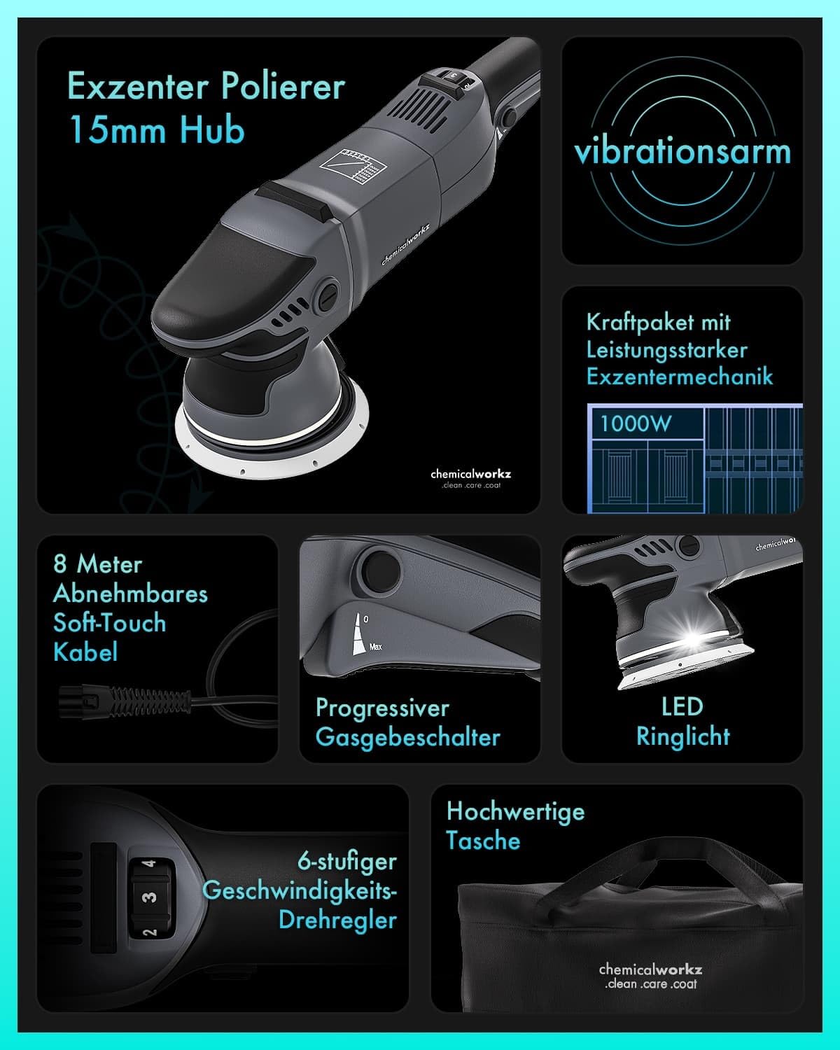 - chemicalworkz DA15 Pro Poliermaschine: Ein professioneller Exzenterpolierer mit kraftvollen 1000 Watt, 15 mm Hub und einem 125 mm Stützteller. Ausgestattet mit einem progressiven Gasgebeschalter, LED-Ringlicht und elektronischer Drehzahlregelung (3000-5300 U/Min) für maximale Präzision.