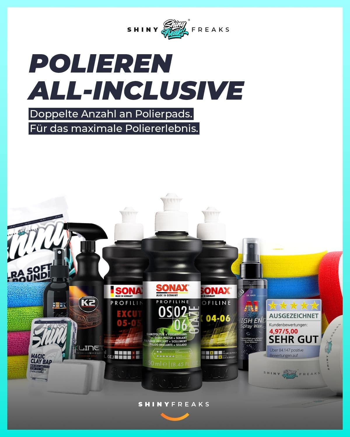 Ja, es ist eine professionelle Komplettlösung. Das 20-teilige Set deckt den gesamten Prozess ab: von der Lackvorbereitung mit Reinigungsknete und Reiniger über die mehrstufige Kratzerentfernung mit Sonax Polituren und Pads bis zur langanhaltenden Dr. Wack Versiegelung. Sie können sofort loslegen.
