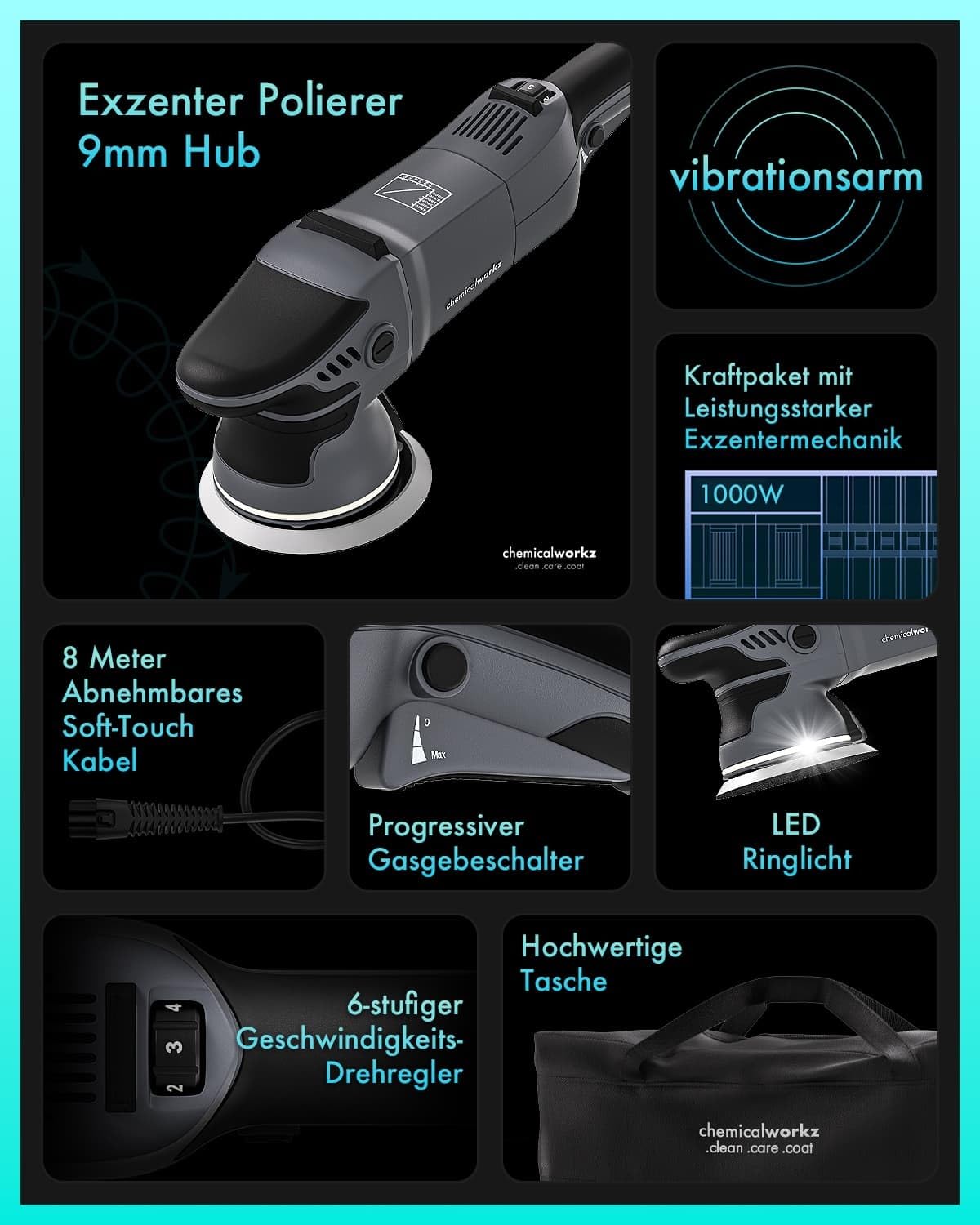 - Leistungsstarke Poliermaschine: Die chemicalworkz DA9 Pro Max Exzenter-Poliermaschine mit 1000 Watt Leistung, 9 mm Hub und einem innovativen LED-Ringlicht für eine schattenfreie Ausleuchtung der Arbeitsfläche.