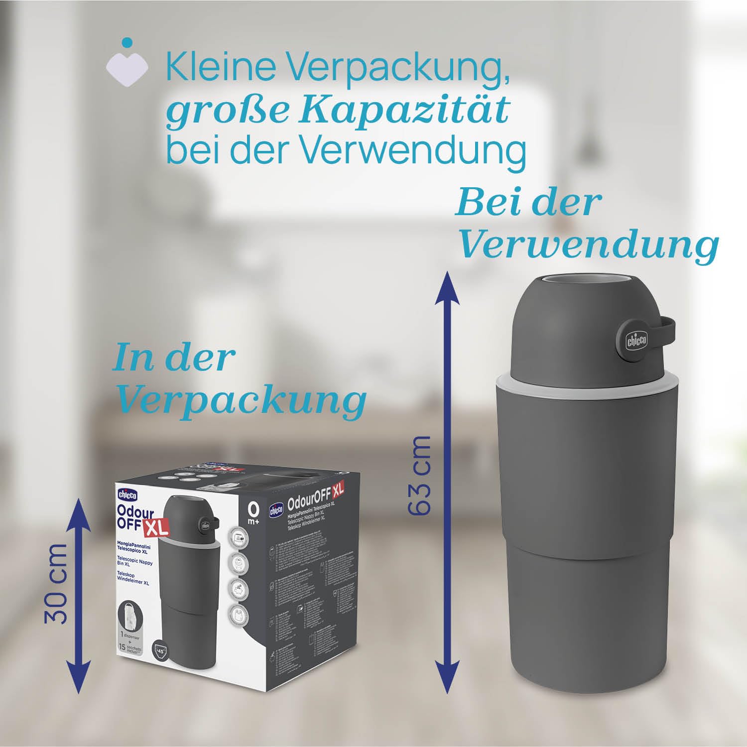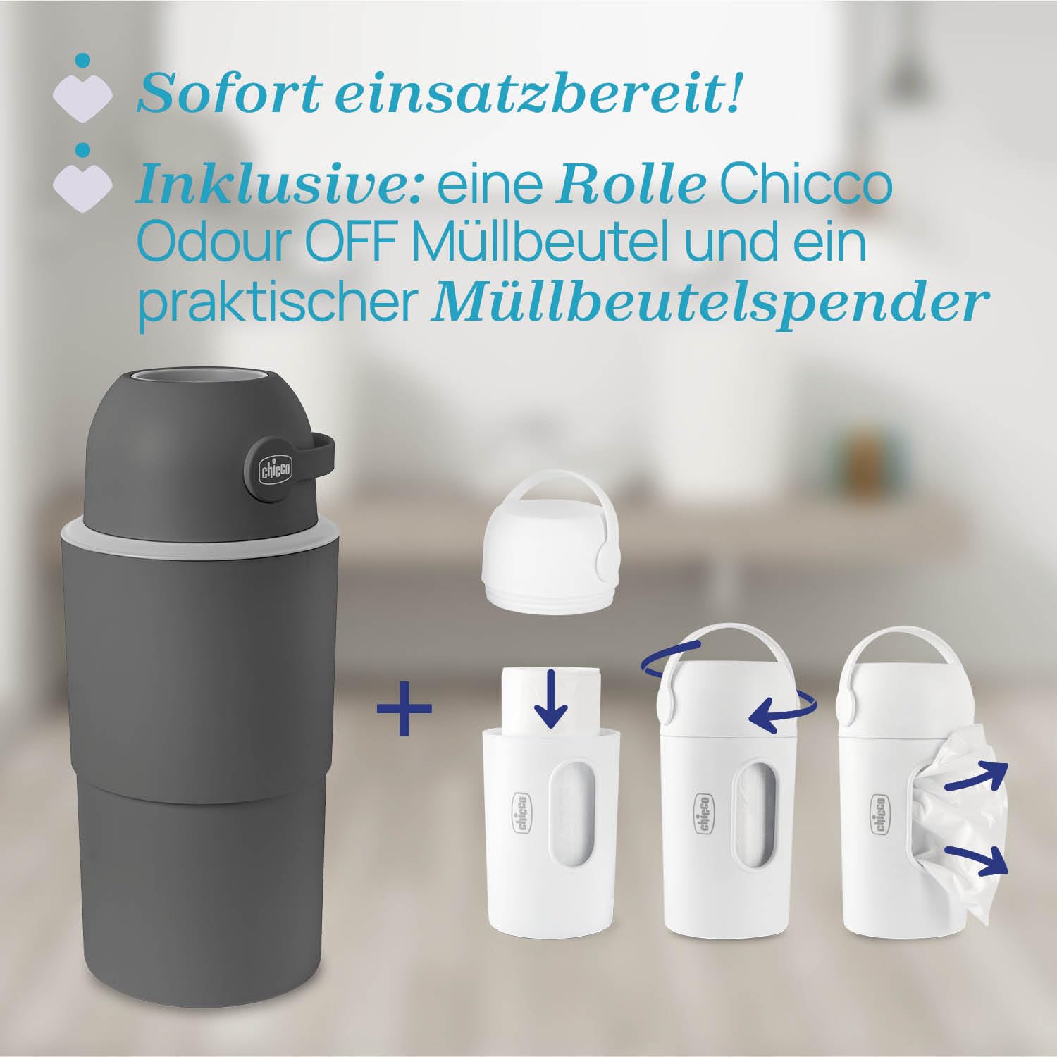 - Keine Nachfüllkassetten nötig: Kann mit handelsüblichen Müllbeuteln verwendet werden, was Kosten spart und die Umwelt schont. Alternativ sind die speziell geformten ODOUR OFF-Beutel von Chicco nutzbar.