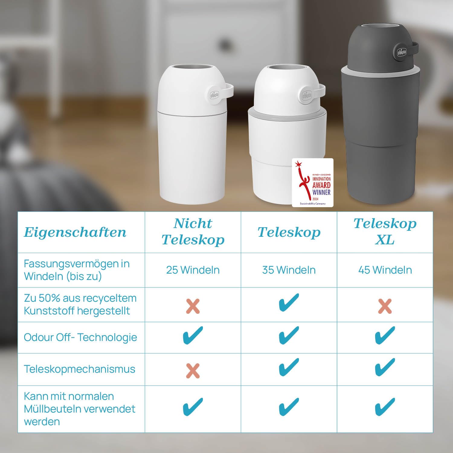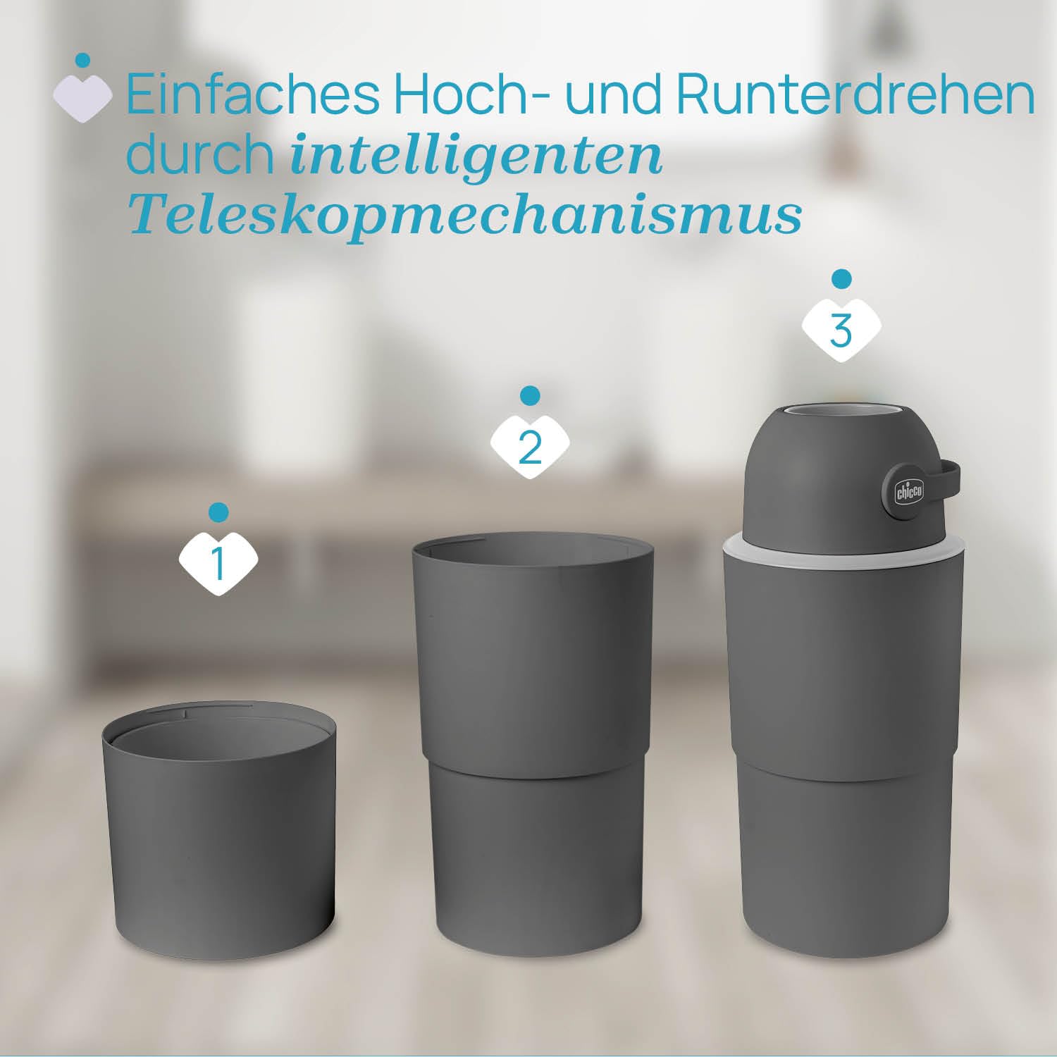 Dank des cleveren Teleskopdesigns ist der Windeleimer ausserordentlich kompakt und lässt sich bei Bedarf mühelos verstauen – ideal auch für kleinere Räume oder für unterwegs.