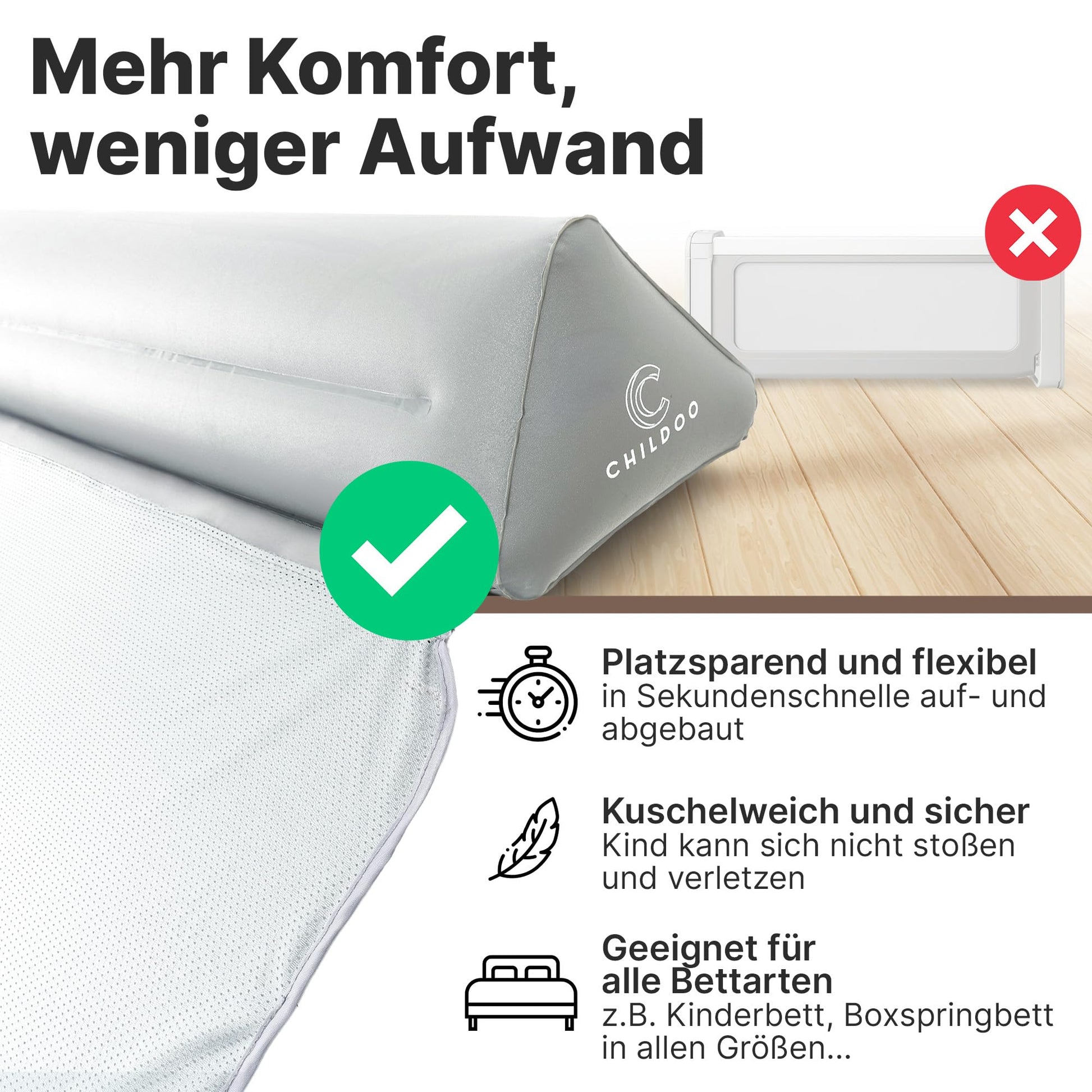 Im Gegensatz zu sperrigen, harten Bettgittern ist unsere Lösung weich, anschmiegsam und geräuschlos. Das atmungsaktive Mesh-Gewebe verhindert Schwitzen und störende Geräusche. Viele Kinder nutzen den weichen Schutz sogar als gemütliches Kissen zum Ankuscheln, was die Akzeptanz enorm steigert.
