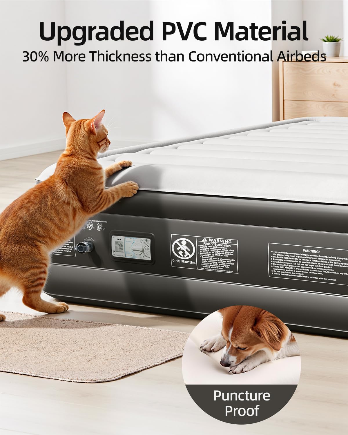 Das Bett ist aus extra dickem, 0.46 mm starkem und strapazierfähigem PVC gefertigt. Die beflockte Oberfläche ist weich, wasserdicht und leicht zu reinigen, was es zu einer langlebigen und luxuriösen Schlaflösung für zu Hause und beim Campieren macht.