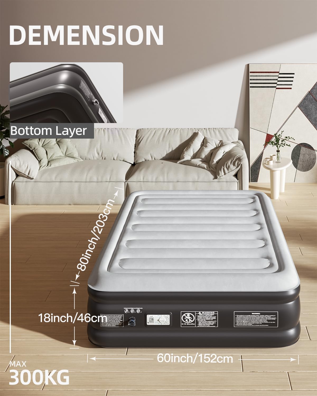 - Integrierte elektrische Pumpe: Das Bett ist mit einer eingebauten Pumpe ausgestattet, die es in nur 3 Minuten vollständig aufbläst – ganz ohne zusätzliches Werkzeug.