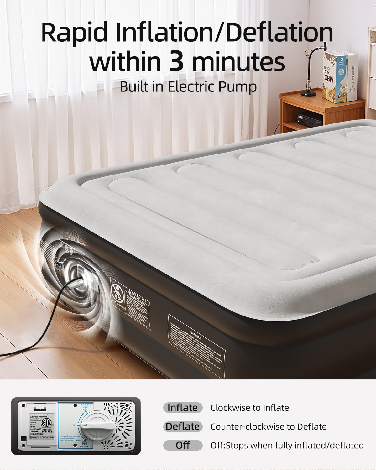 - Integrierte Pumpe: Dank der eingebauten, kabellosen Pumpe ist das Luftbett in nur 3 Minuten vollständig und ohne zusätzliche Geräte einsatzbereit.
