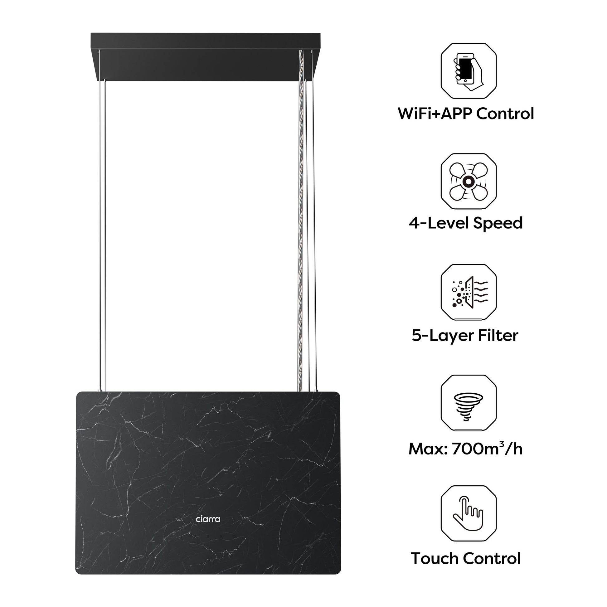 - Smarte Wi-Fi Steuerung: Bedienen Sie die Dunstabzugshaube bequem über eine Smartphone-App und wählen Sie einfach zwischen den vier verschiedenen Leistungsstufen, inklusive Booster-Funktion.