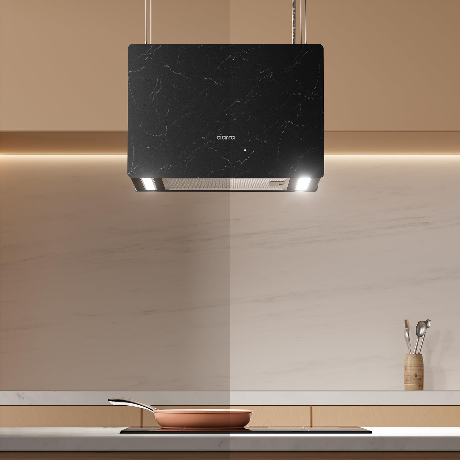 Das schwebende Design über der Kochinsel sorgt für maximale Kopffreiheit und ein offenes, modernes Raumgefühl. Zudem verfügt die Haube über eine energieeffiziente LED-Beleuchtung, deren Helligkeit in zwei Stufen reguliert werden kann, um Ihre Kochfläche perfekt auszuleuchten.