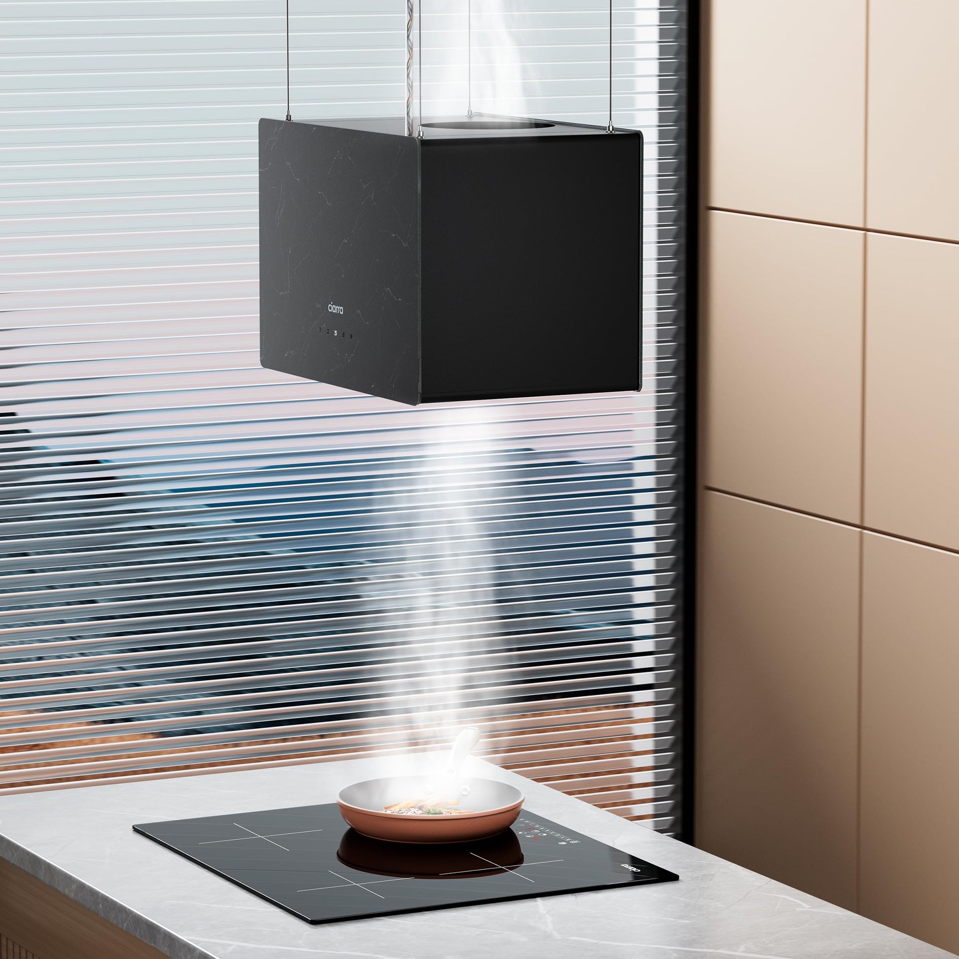 Verwandeln Sie Ihre Kochinsel in das stilvolle Zentrum Ihrer Küche mit dieser freihängenden Dunstabzugshaube. Sie kombiniert ein markantes Design in Betonoptik mit leistungsstarker Technologie und smarter Bedienung.