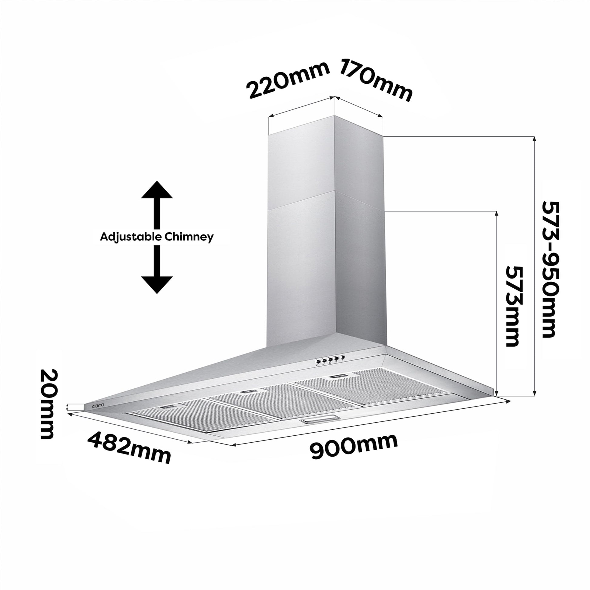 Diese 90 cm breite Dunstabzugshaube von CIARRA im klassischen Pyramiden-Design kombiniert starke Leistung mit einem eleganten Erscheinungsbild aus Edelstahl für Ihre Küche.