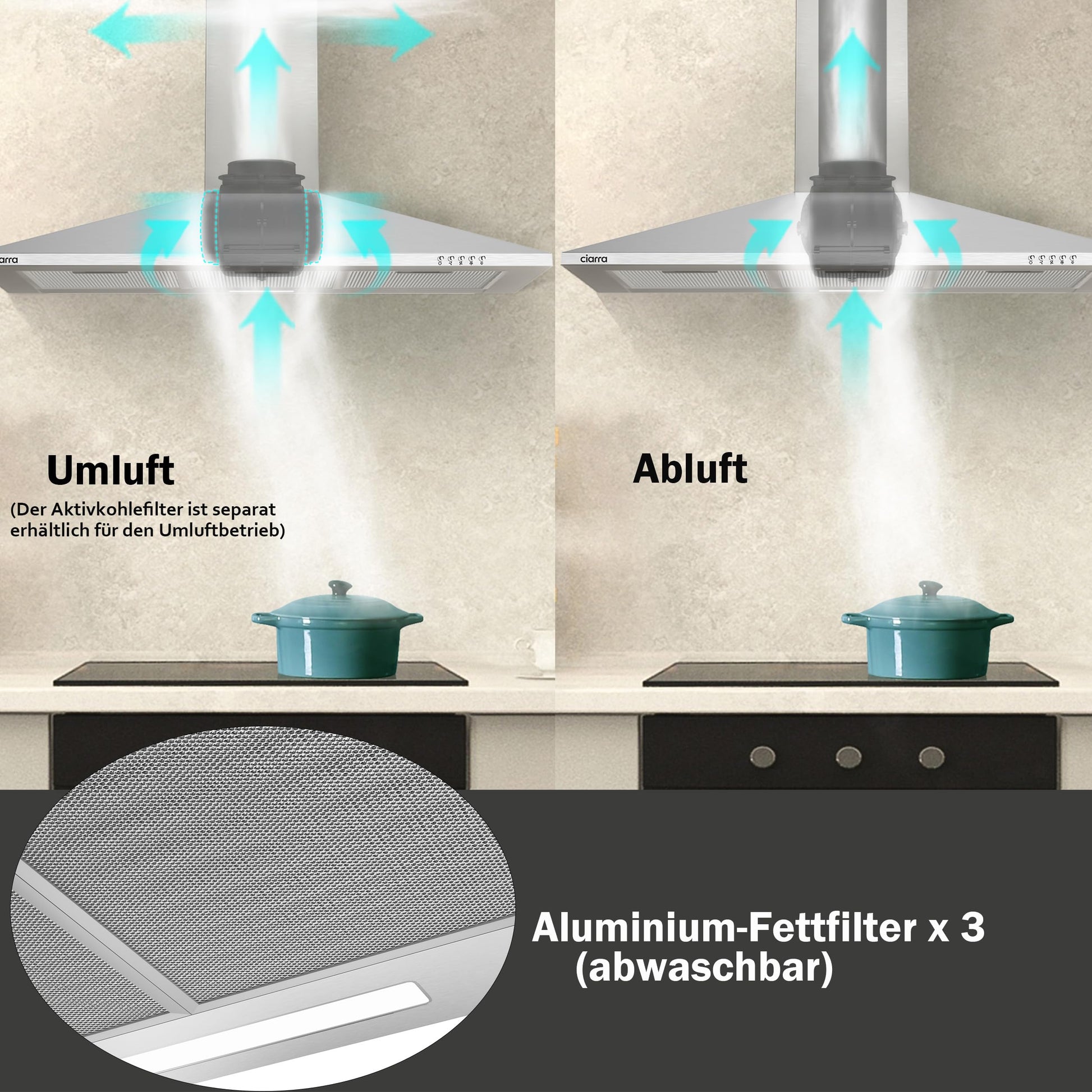 Ja, die CIARRA CAS9201A ist flexibel für beide Betriebsarten konzipiert. Für den Abluftbetrieb wird die Luft nach aussen geleitet. Für den Umluftbetrieb, bei dem die Luft gefiltert und zurück in die Küche geführt wird, benötigen Sie zusätzlich den passenden Kohlefilter (Modell CBCF002), der separat erhältlich ist.