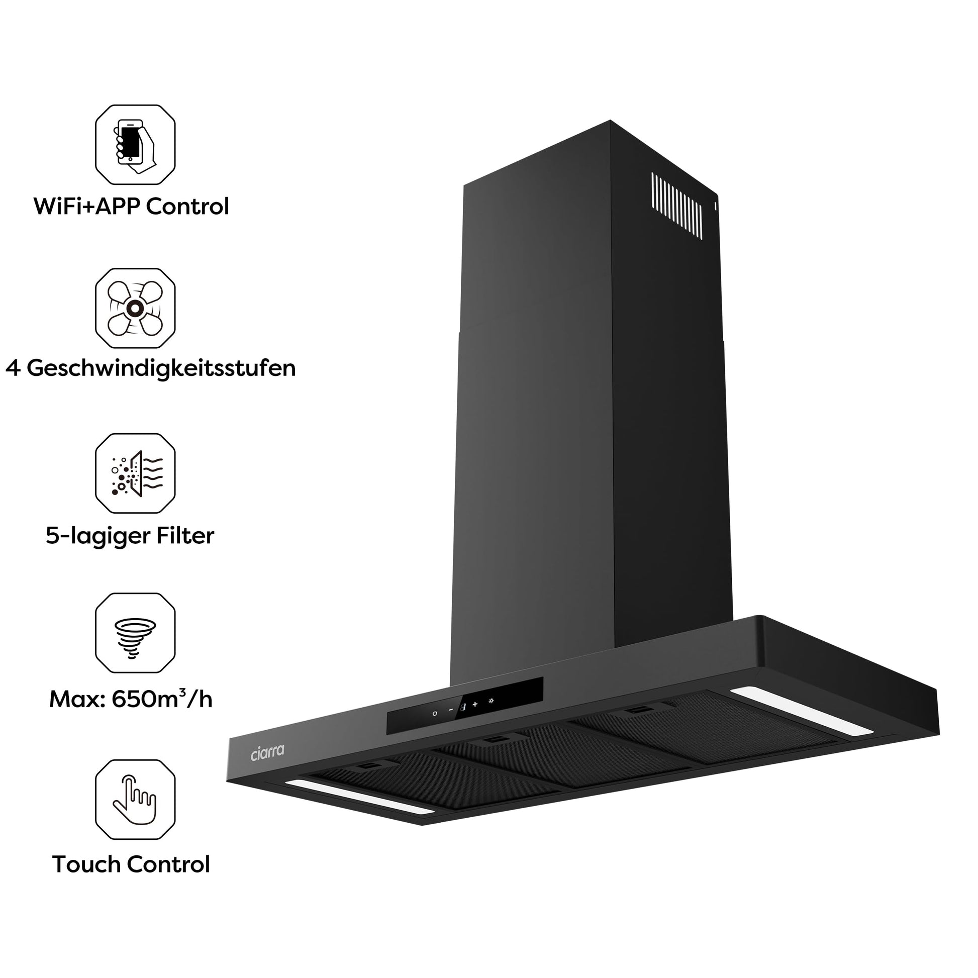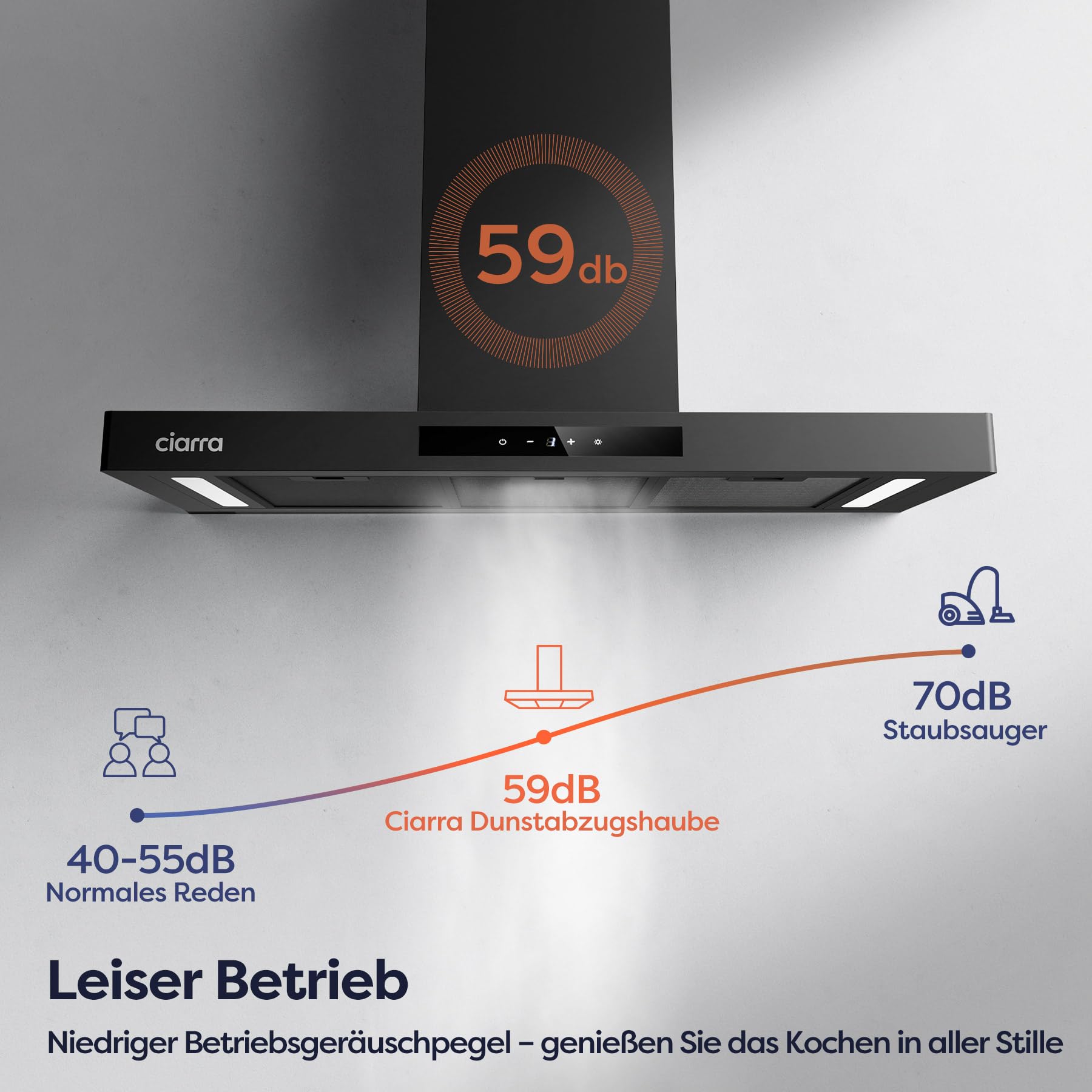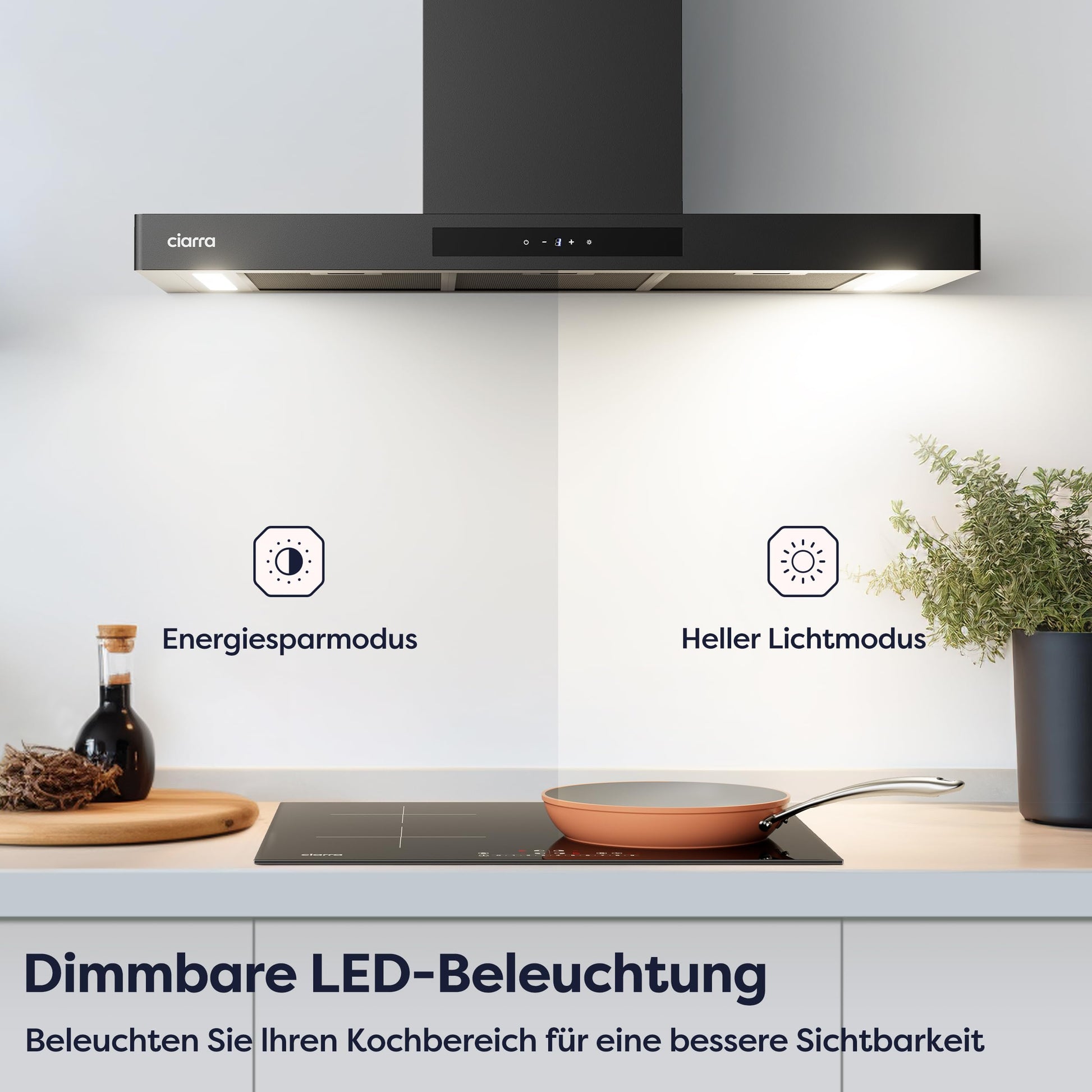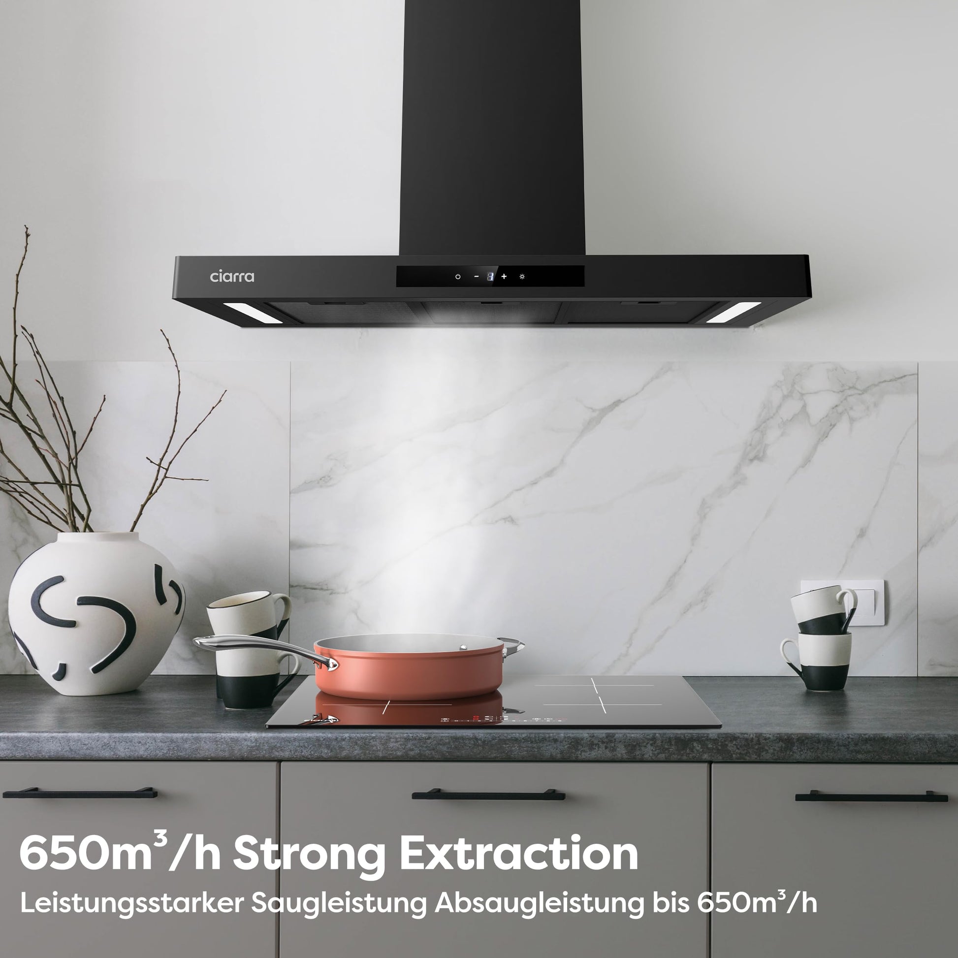 Die CIARRA CBCB9102-P ist mit 90 cm Breite ideal für Standard-Kochfelder von 80-90 cm. Dank ihrer starken Absaugleistung von 650 m³/h ist sie perfekt für mittlere bis grosse Küchen geeignet und stellt sicher, dass Kochdünste und Gerüche zuverlässig beseitigt werden.