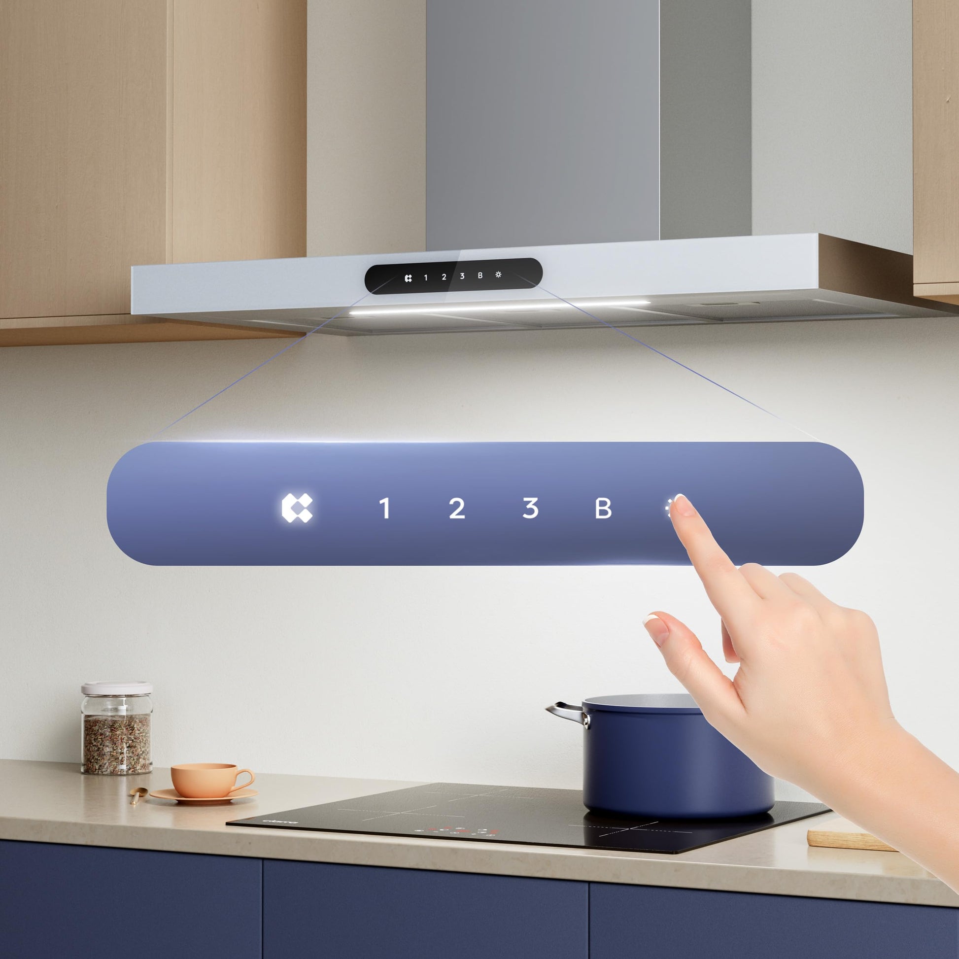 - Dimmbare LED-Beleuchtung: Zwei Helligkeitsstufen für eine optimale und zugleich sparsame Ausleuchtung der Kochfläche.