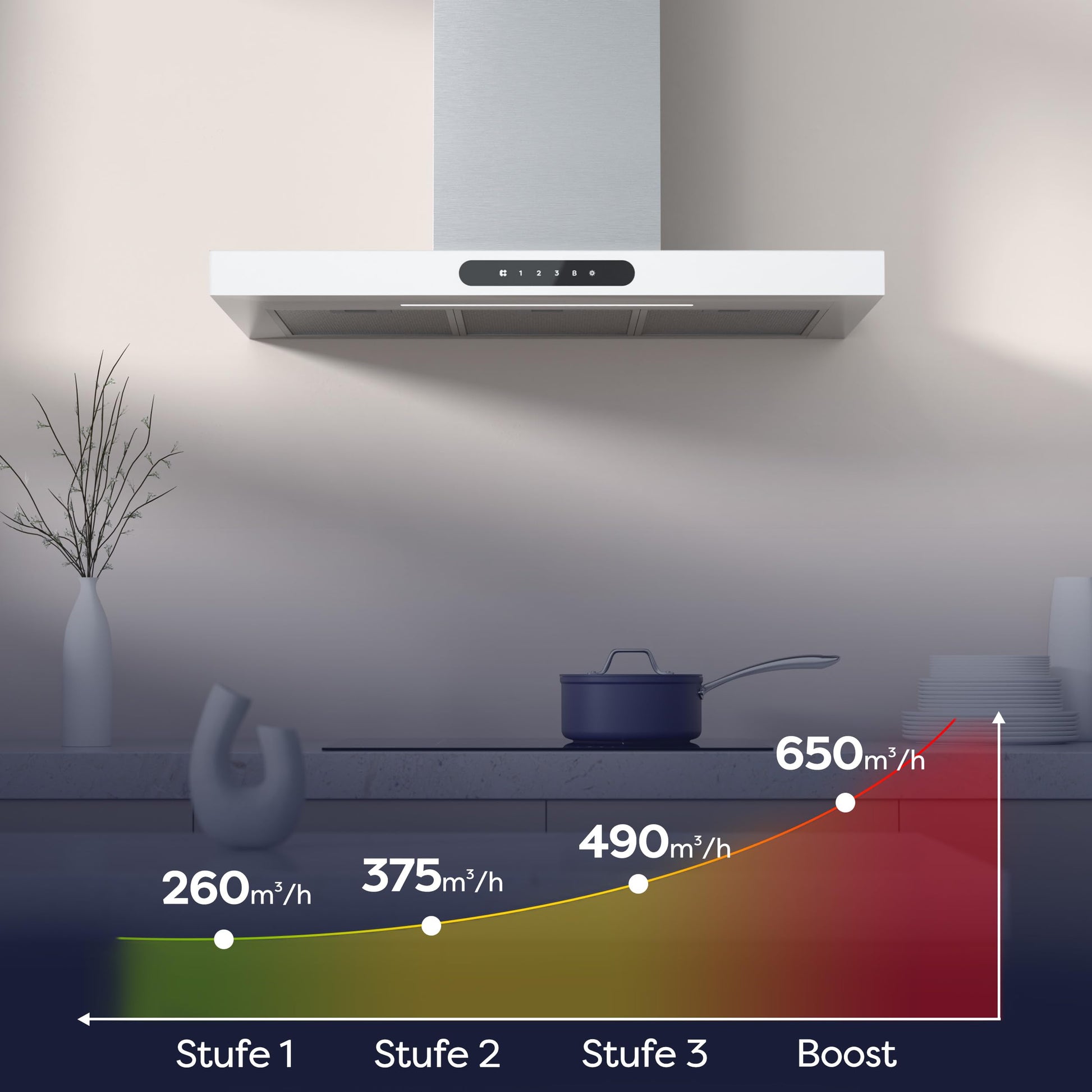 - Leistungsstarke Absaugung: Mit 650 m³/h Luftumwälzung sorgt die Haube schnell für geruchsfreie und saubere Küchenluft.