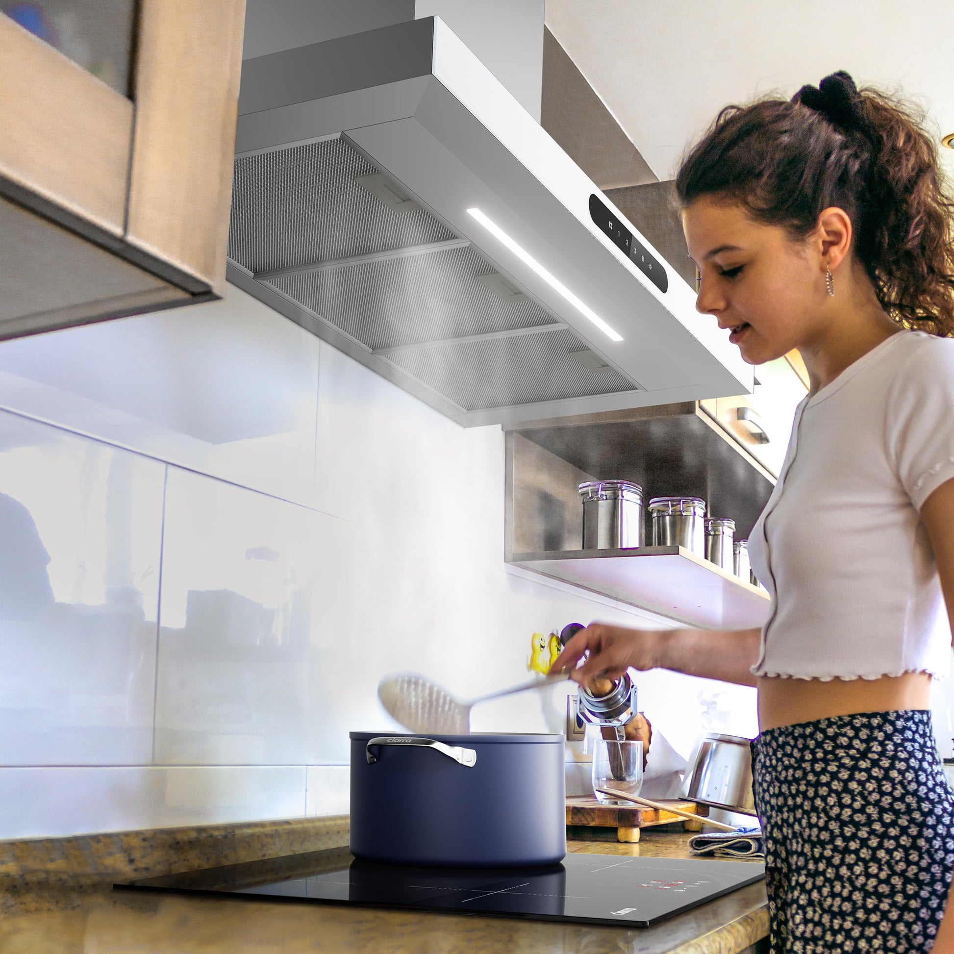 Die Ciarra Dynamic Dunstabzugshaube vereint eine kraftvolle Absaugleistung mit modernster Technologie und einem eleganten Design aus weissem Glas und Edelstahl für Ihre Küche.