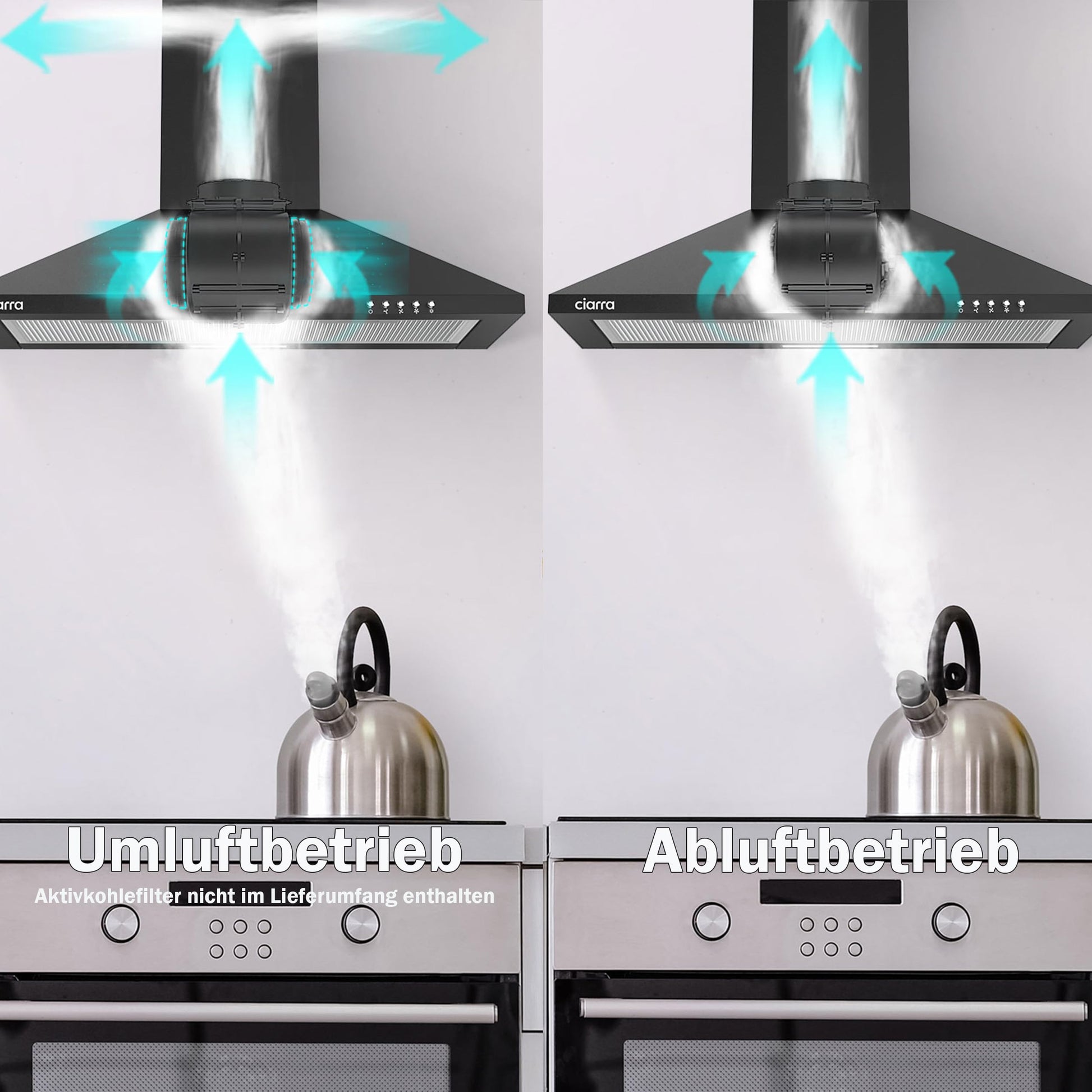 Ja, die CIARRA CAB6201A ist flexibel für den Abluft- und Umluftbetrieb konzipiert. Für den Umluftbetrieb benötigen Sie zusätzlich passende Aktivkohlefilter (Modell CBCF002, separat erhältlich), um Gerüche effektiv aus der Luft zu filtern.