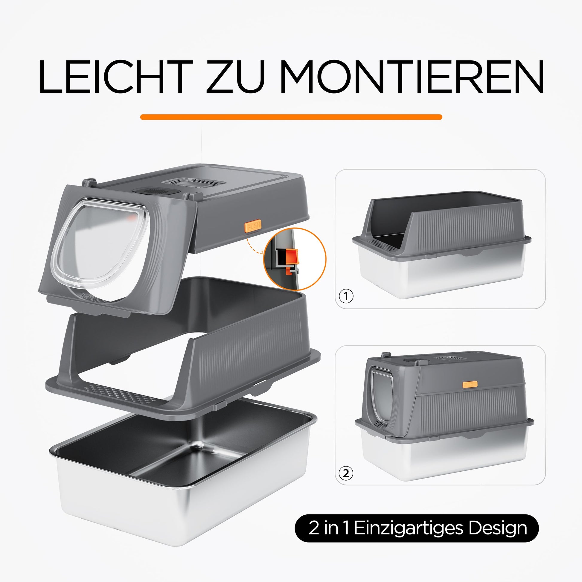 Ja, das Design ist sehr flexibel. Dank der dreiteiligen Konstruktion können Sie die Toilette wahlweise als komplett geschlossene Box, als halb offene Variante (nur mit dem hohen Rand) oder auch nur als offene Edelstahlschale nutzen, ganz nach den Vorlieben und Bedürfnissen Ihrer Katze.
