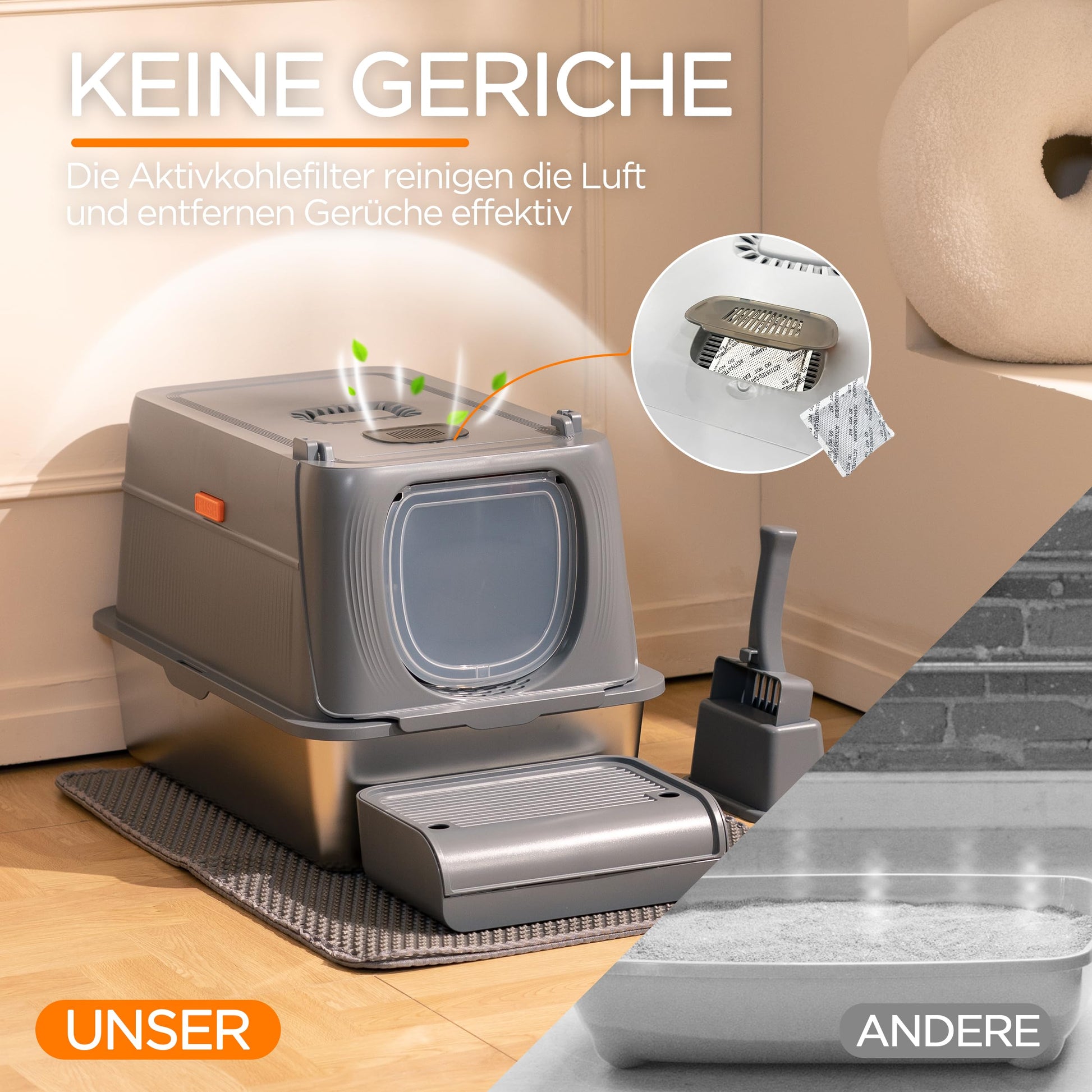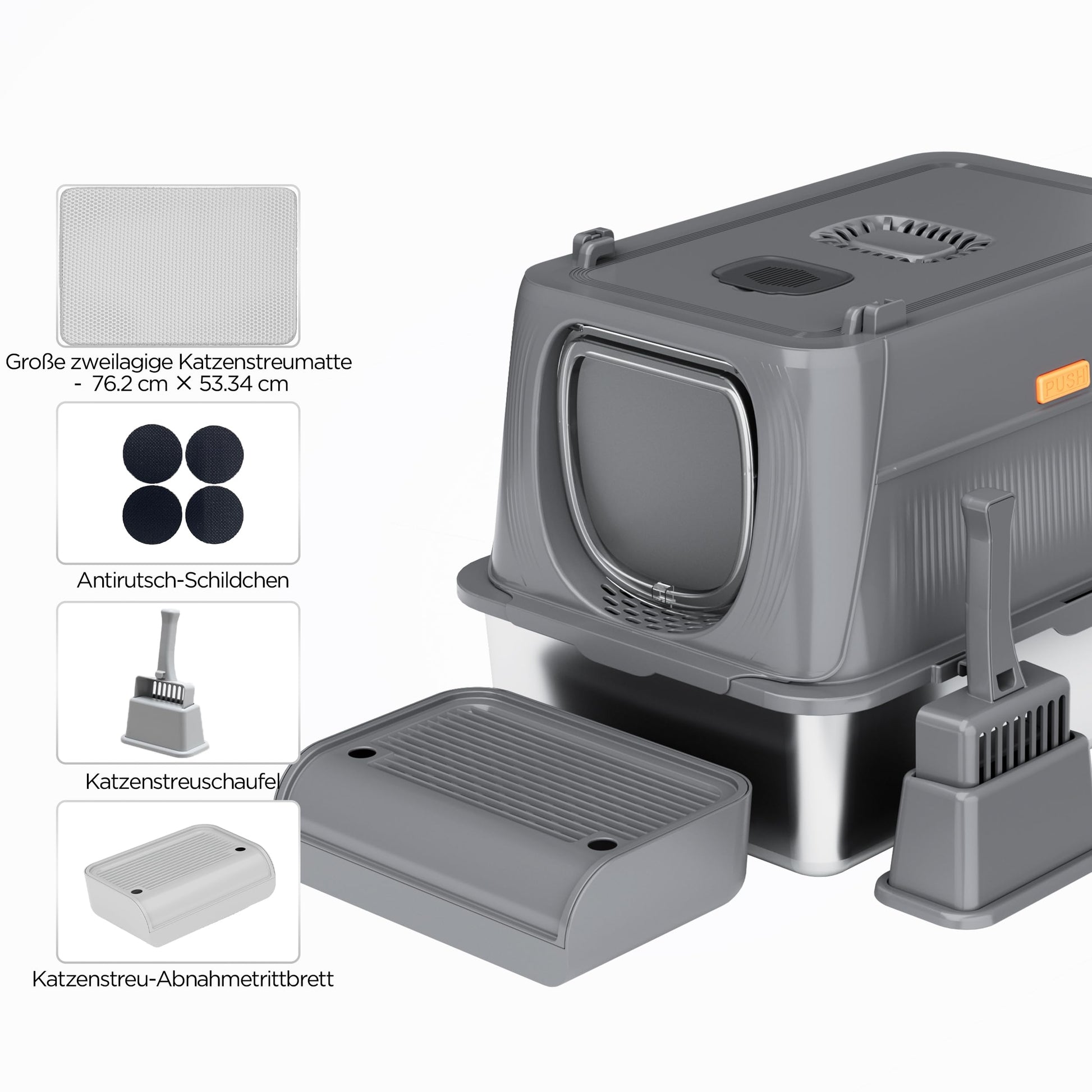 Das Set beinhaltet alles, was Sie für den Start benötigen: die dreiteilige Katzentoilette mit Edelstahlwanne und Deckel, einen integrierten Aktivkohlefilter zur Geruchsbindung, eine passende Doppelschicht-Matte, die Streu von den Pfoten fängt, sowie eine robuste und praktische Streuschaufel.