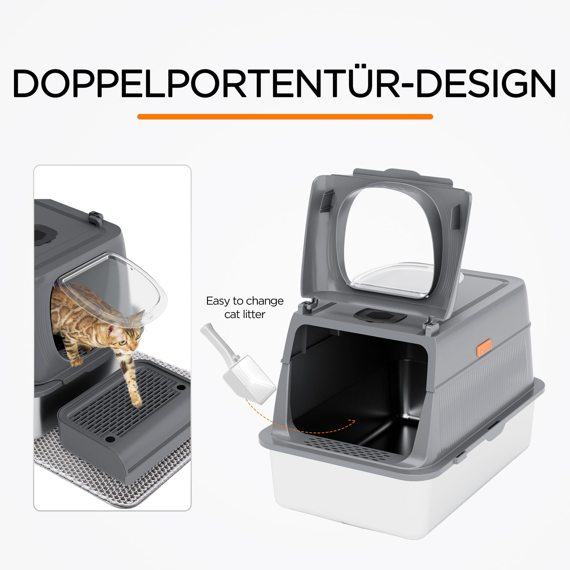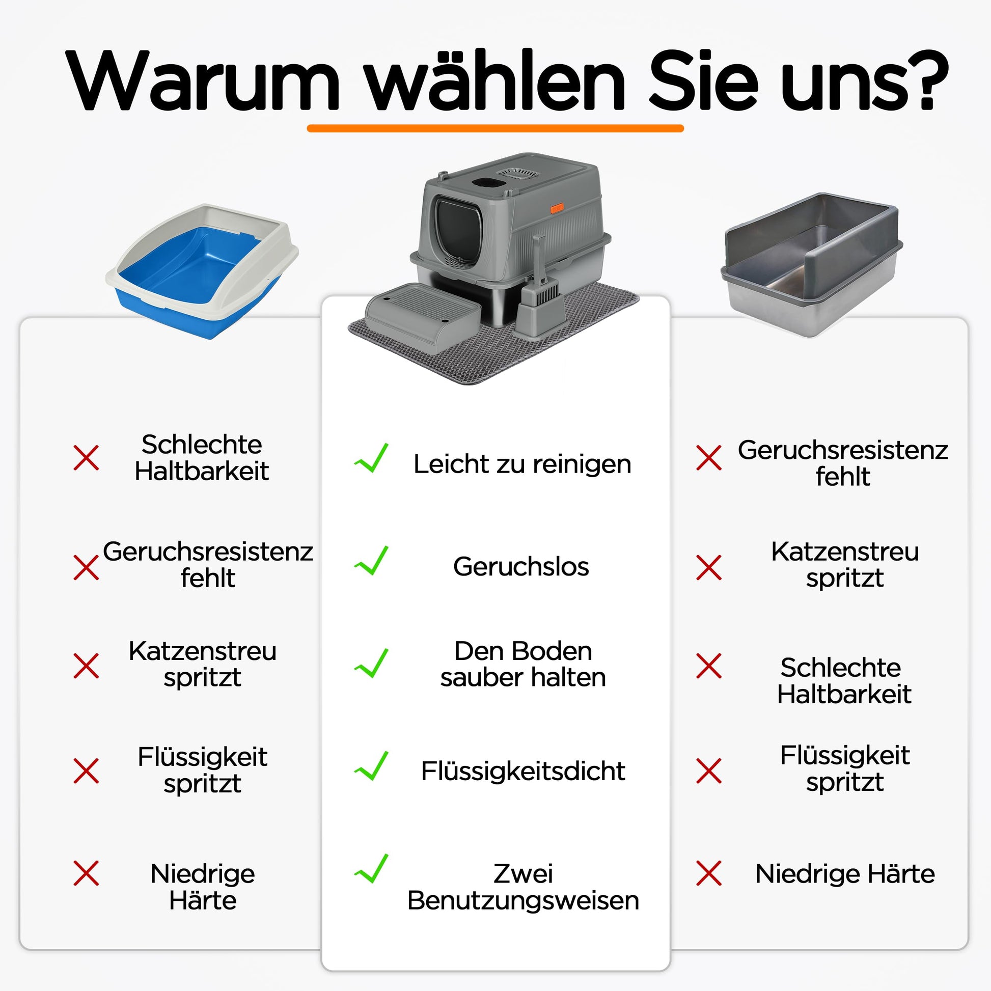- Komplettes Zubehör-Set: Im Lieferumfang sind eine passende Doppelschicht-Matte, die Streu von den Pfoten auffängt, sowie eine praktische Streuschaufel enthalten.