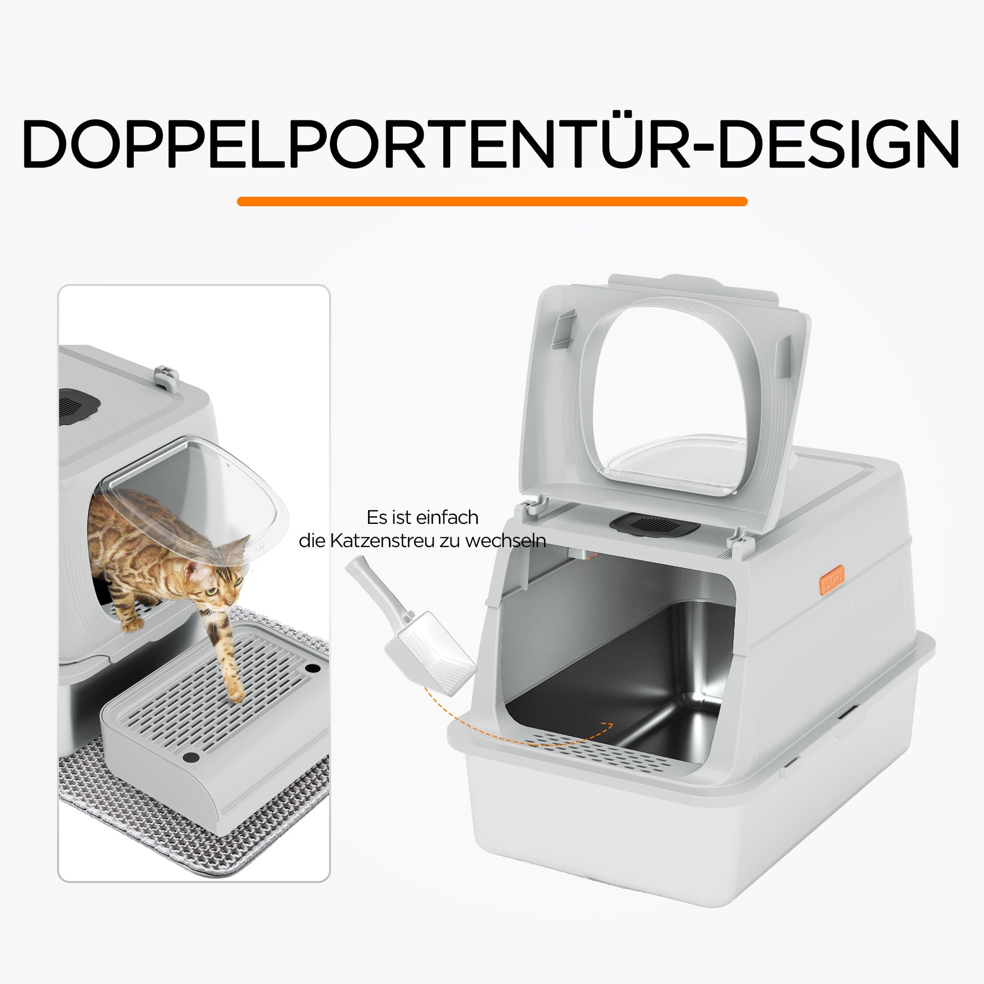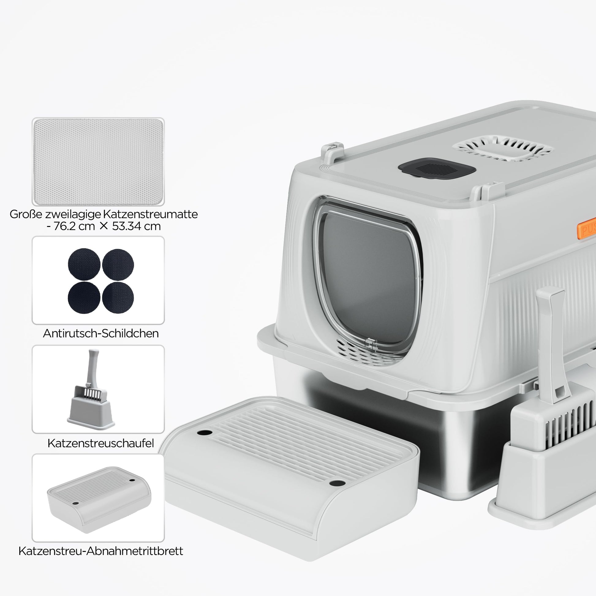 Das Komplettset beinhaltet die dreiteilige Katzentoilette (Edelstahl-Unterschale, Aufsatzrahmen und Haube), eine passende Streuschaufel sowie eine Doppelschicht-Streumatte. Dank der flexiblen Konstruktion mit Schnappverschlüssen können Sie die Haube einfach abnehmen und die Toilette als offenes oder halb offenes System nutzen.