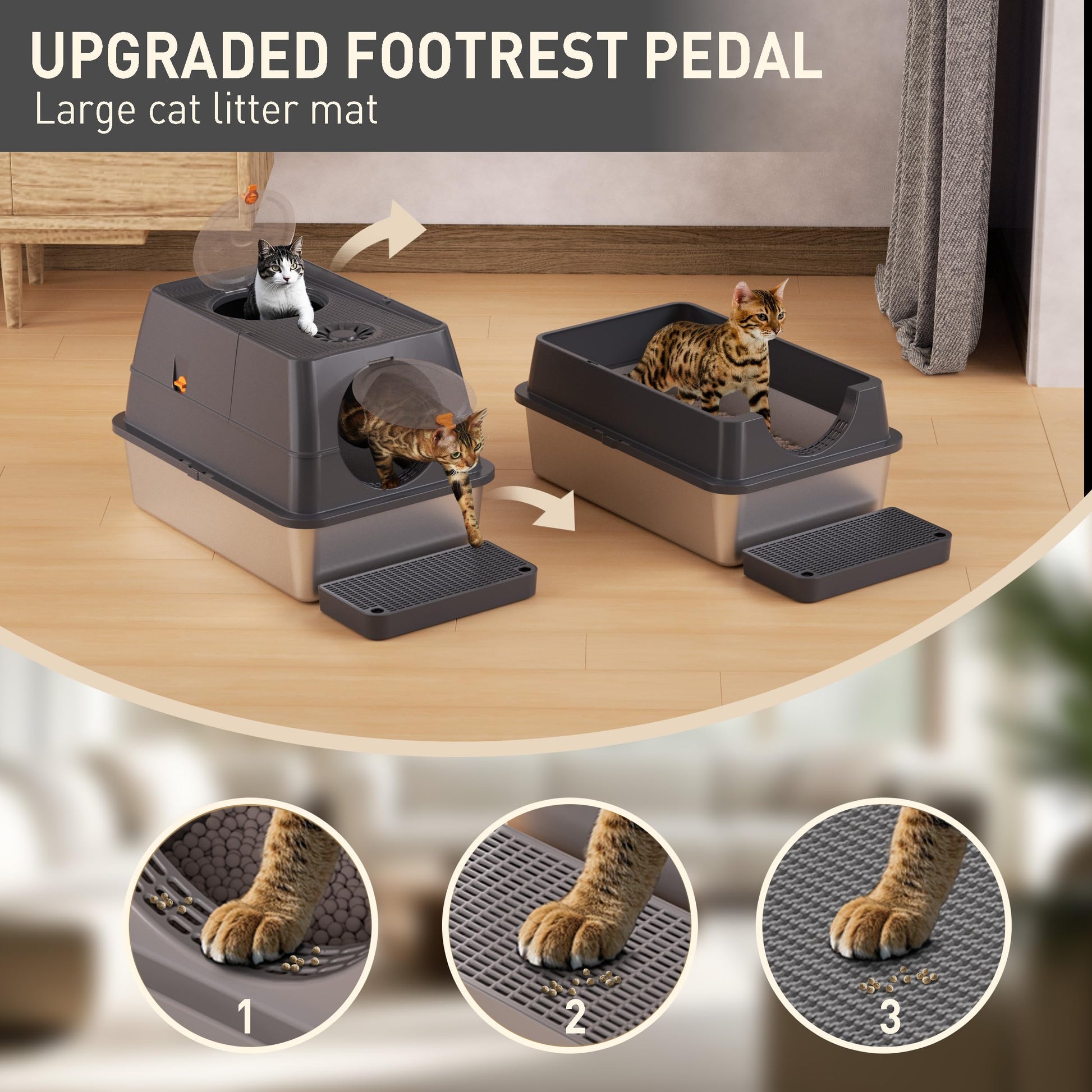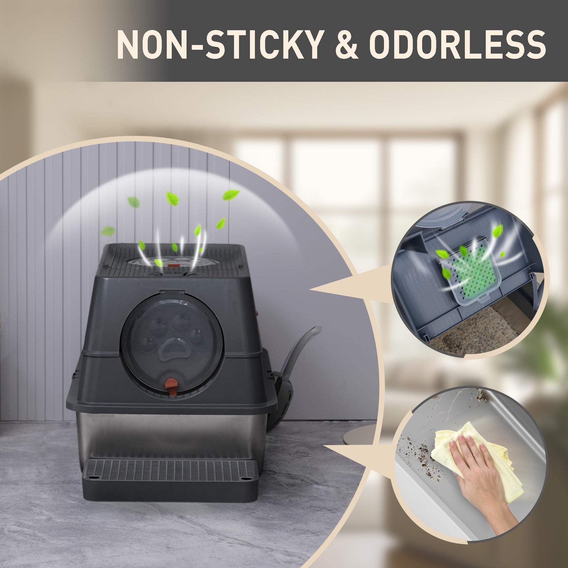 - Intelligentes Zwei-Wege-System: Katzen können wahlweise durch die vordere Schwingtür eintreten und über die obere Öffnung austreten, was das Verteilen von Katzenstreu in der Wohnung drastisch reduziert.