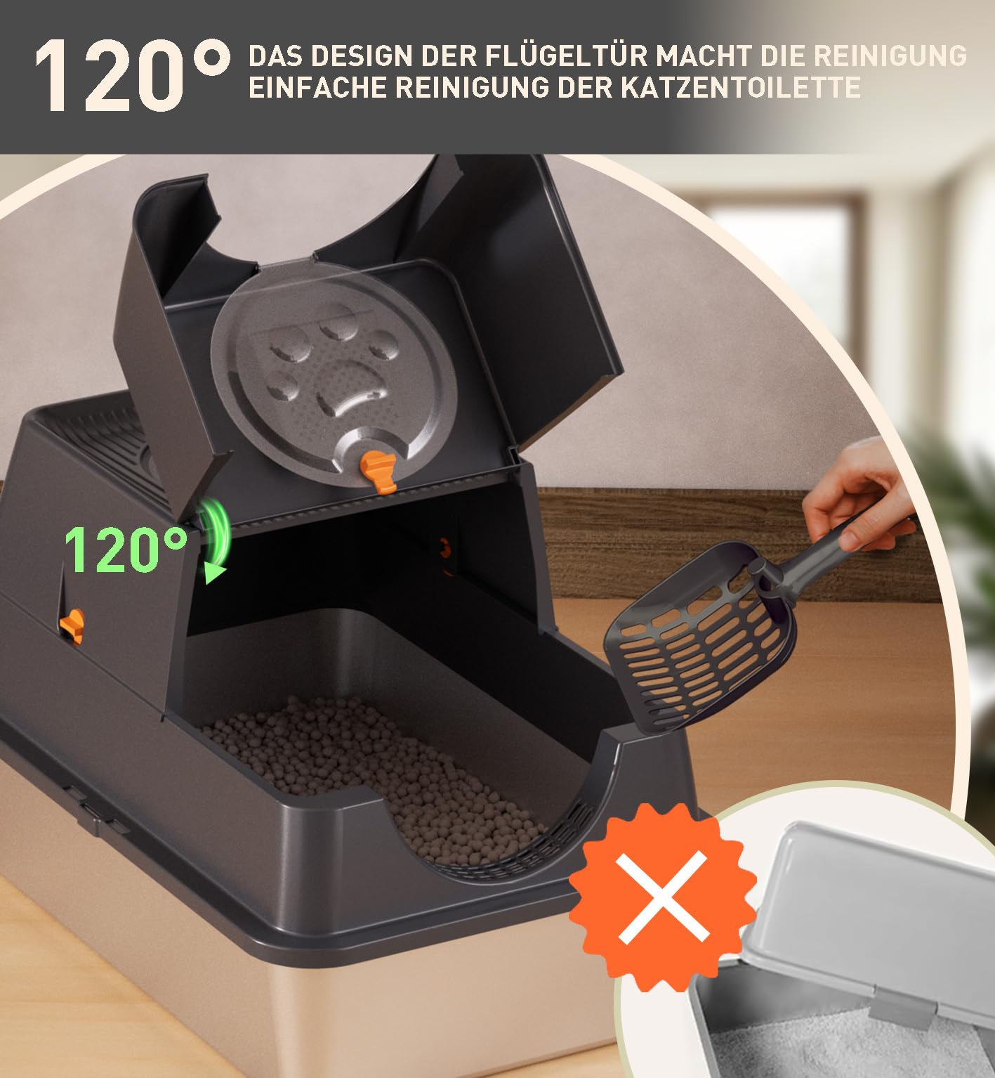 Die tägliche Reinigung wird durch den praktischen 120-Grad-Klappdeckel zum Kinderspiel. Sie müssen nicht die ganze Abdeckung entfernen, um Klumpen mit der mitgelieferten Schaufel zu entfernen. Das durchdachte Design mit dem oberen Ausstieg und dem gerillten Deckel sorgt dafür, dass Katzenstreu von den Pfoten abgestreift wird und im Behälter bleibt. So geniessen Sie maximale Hygiene und ein stets sauberes Zuhause.