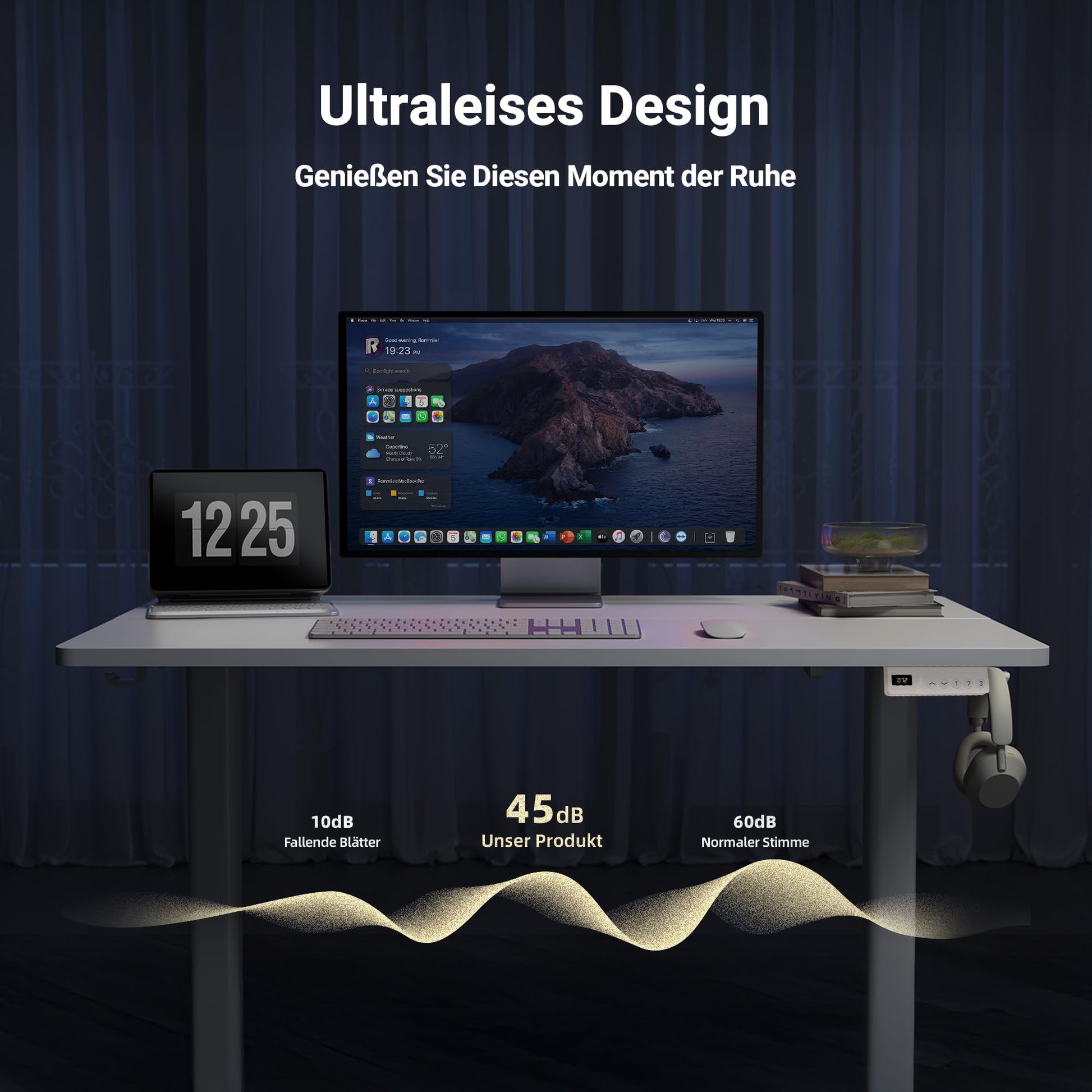 Der Tisch ist für den täglichen Gebrauch optimiert. Der kraftvolle Motor arbeitet mit unter 45 dB extrem leise, sodass Sie oder Ihre Kollegen nicht gestört werden. Die drei Speicherplätze ermöglichen einen schnellen und nahtlosen Wechsel zwischen Ihren bevorzugten Sitz- und Stehhöhen, was einen dynamischen und gesunden Arbeitsalltag fördert.
