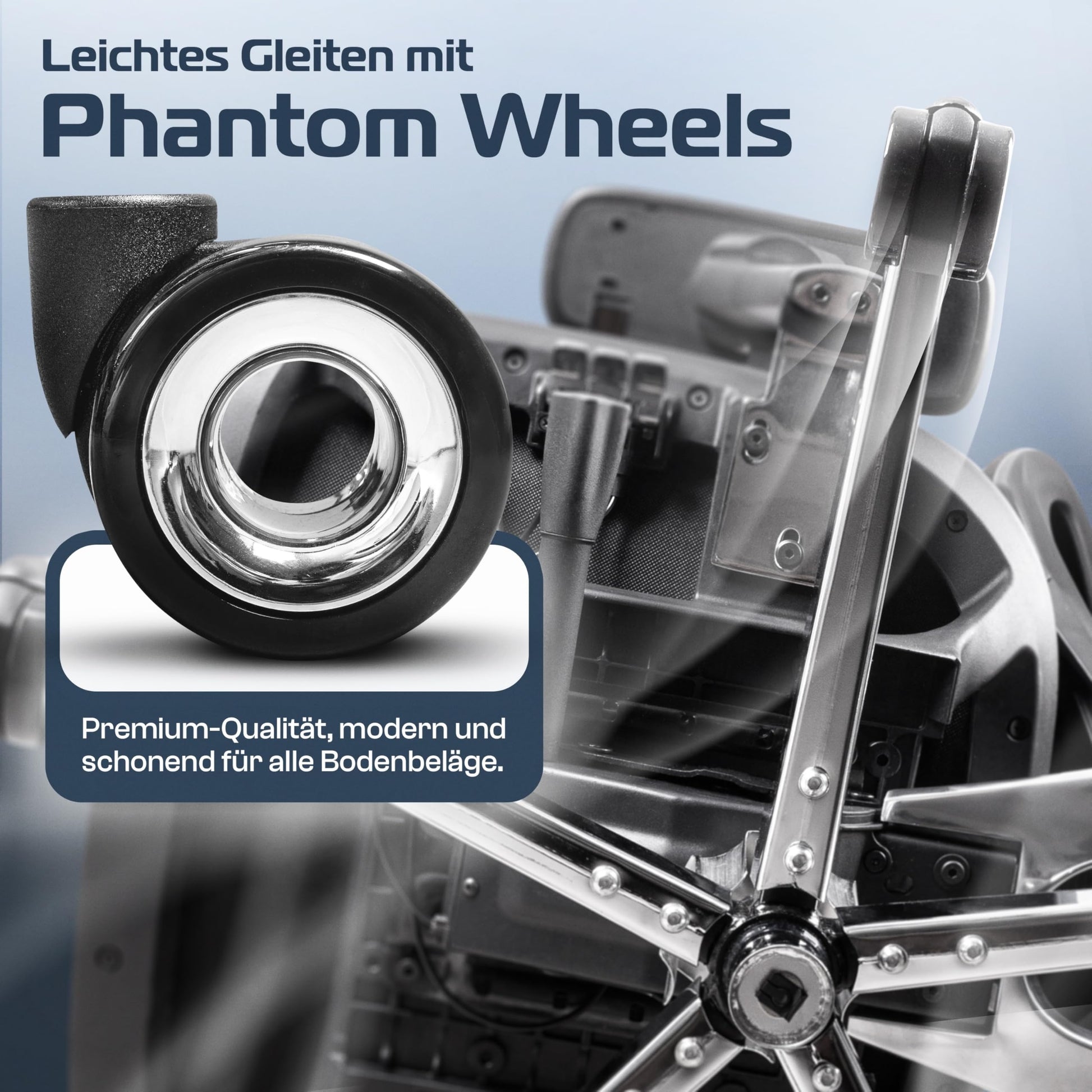 - Exklusive, bodenschonende und beinahe lautlose Phantom Wheels.
