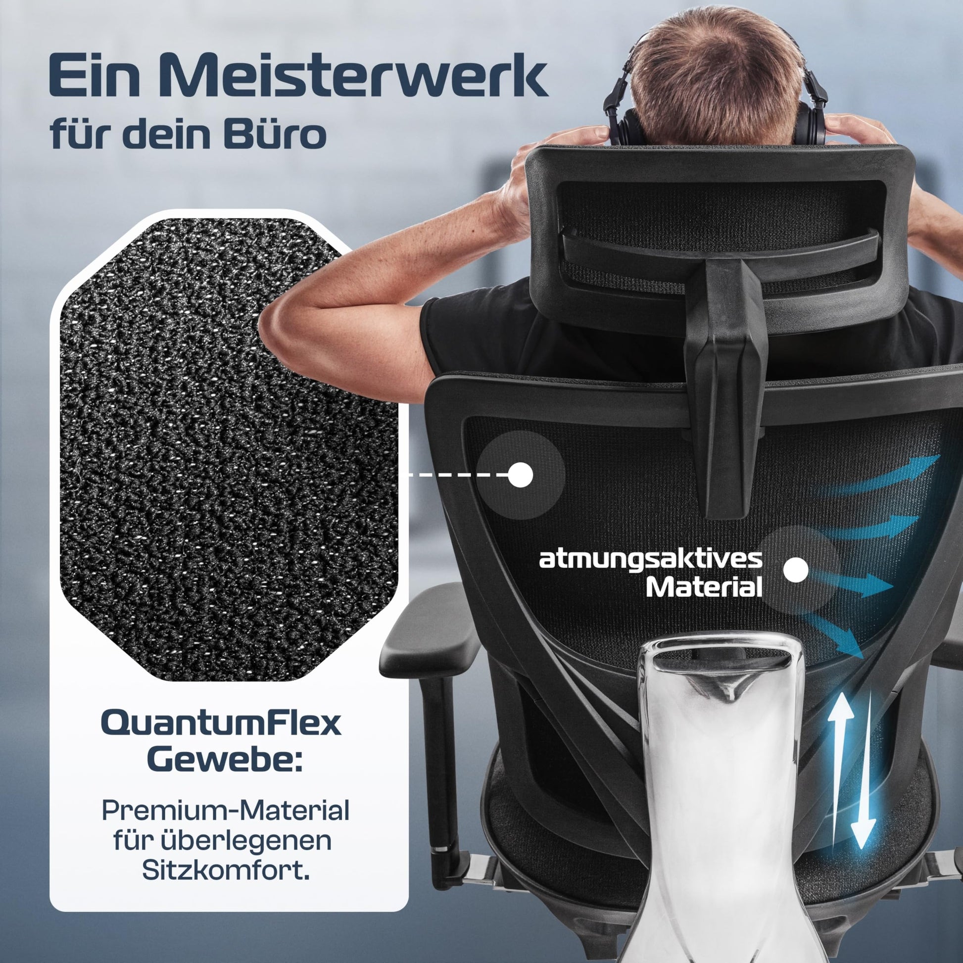 Der MasterSeat lässt sich bis ins Detail an Ihre Statur anpassen. Er verfügt über eine 3D-Kopfstütze, 4D-Armlehnen für variable Armpositionen, eine integrierte Lordosenstütze und eine höhenverstellbare Rückenlehne. Diese präzisen Einstellungen fördern eine gesunde Haltung und beugen Verspannungen vor.