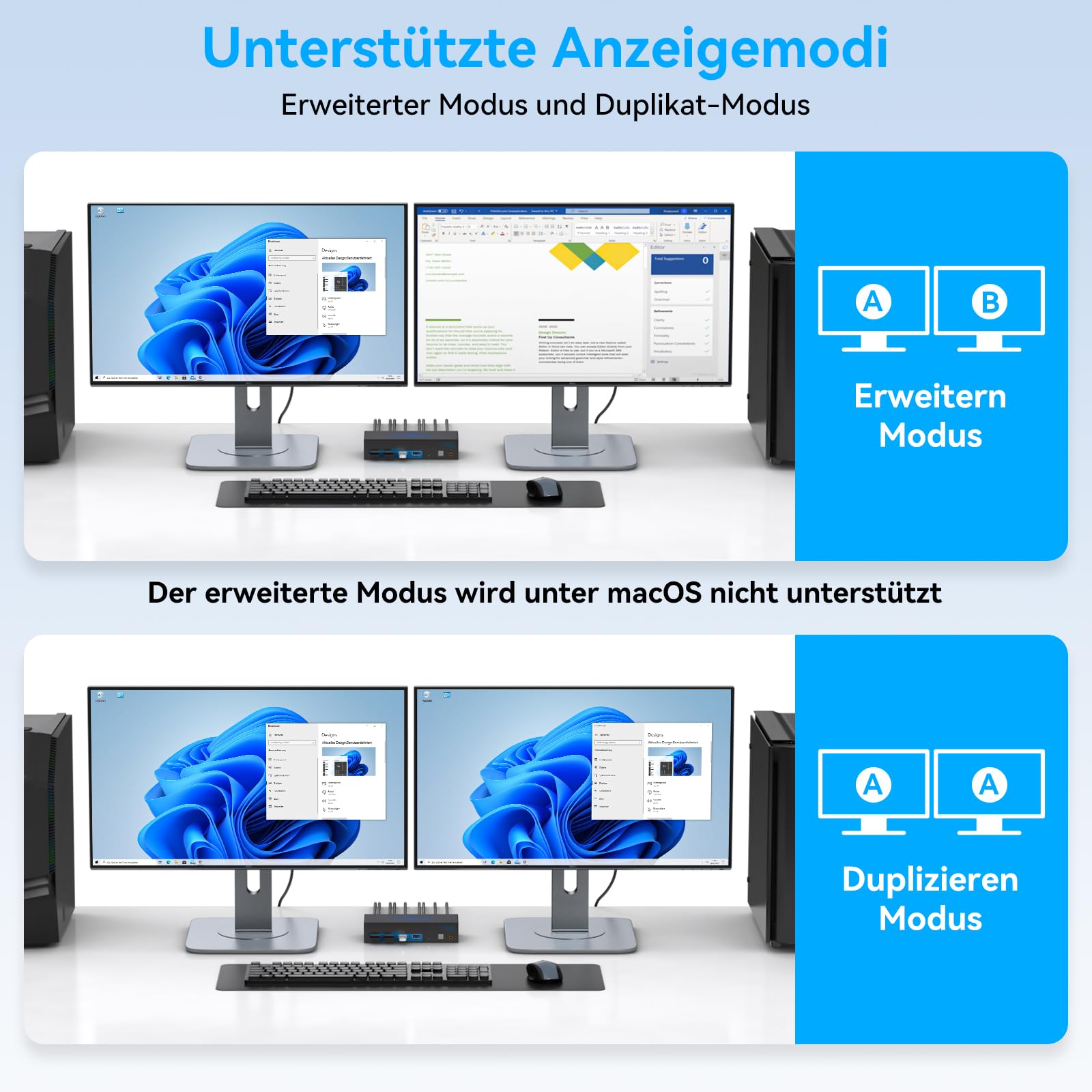 - Anschluss von Laptops: Um zwei Monitore über einen Laptop zu betreiben, muss dieser über einen Thunderbolt-Anschluss sowie eine Dockingstation mit zwei DisplayPort-Ausgängen verfügen.