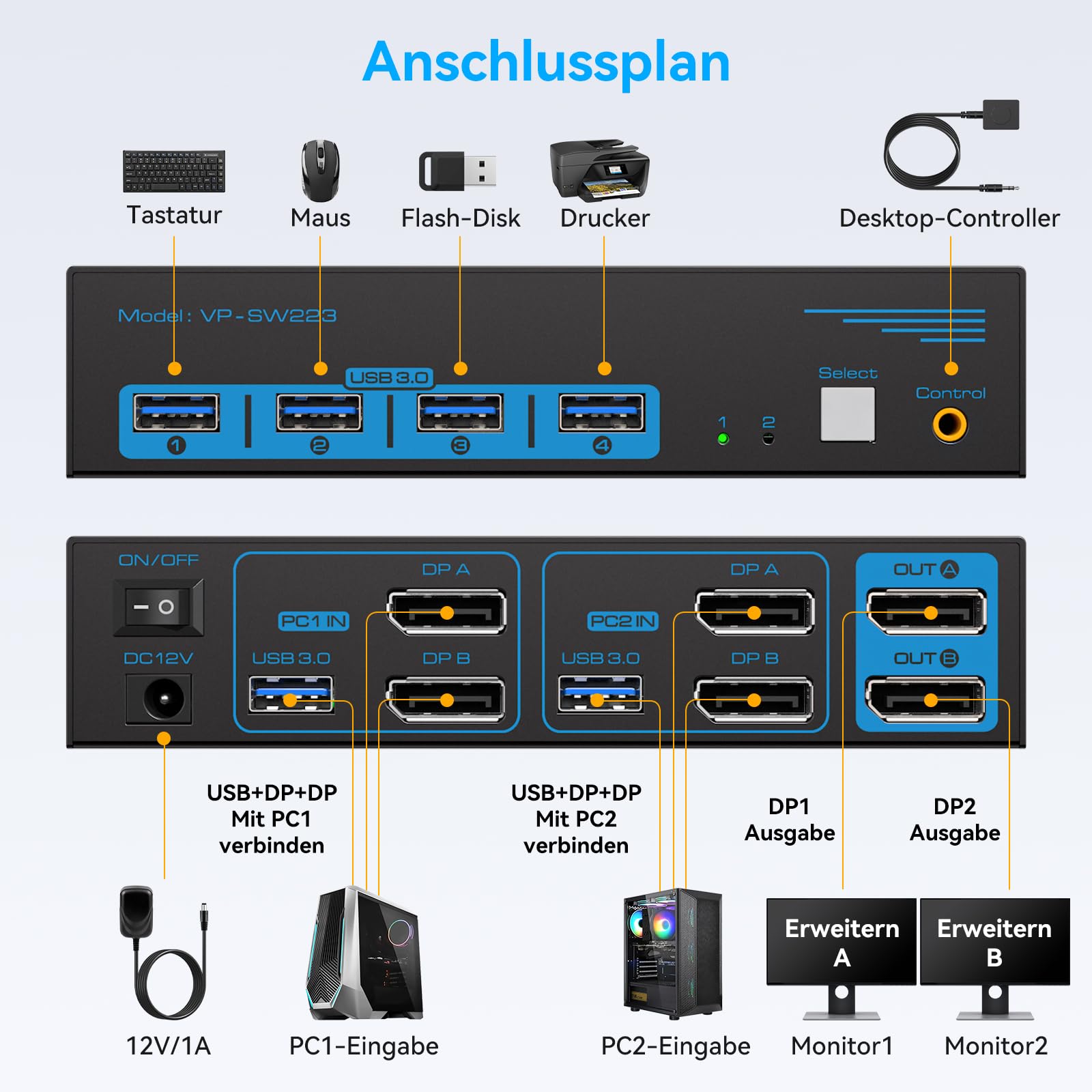 - Umschaltung: Der Wechsel zwischen den PCs erfolgt ausschliesslich über den mitgelieferten Desktop-Controller. Eine Umschaltung via Hotkey wird nicht unterstützt.
