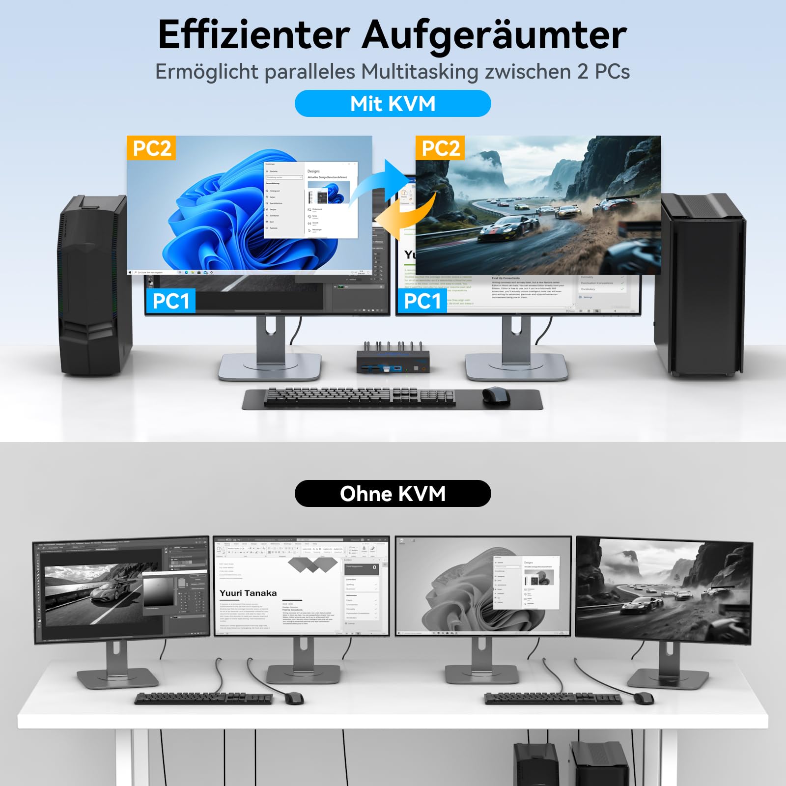 - Dual-PC & Dual-Monitor-Setup: Ermöglicht zwei Computern die gemeinsame Nutzung von zwei Bildschirmen sowie bis zu vier USB-Peripheriegeräten.