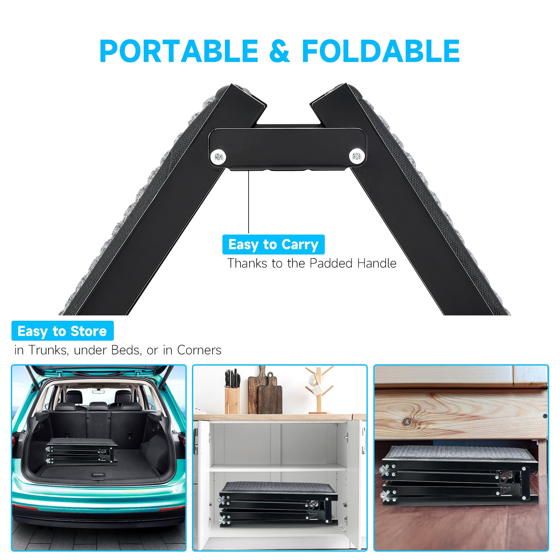 - Kompakt und tragbar: Die Rampe lässt sich einfach auf ein Mass von 44 x 40 x 14 cm zusammenklappen und dank des gepolsterten Griffs bequem transportieren und verstauen.