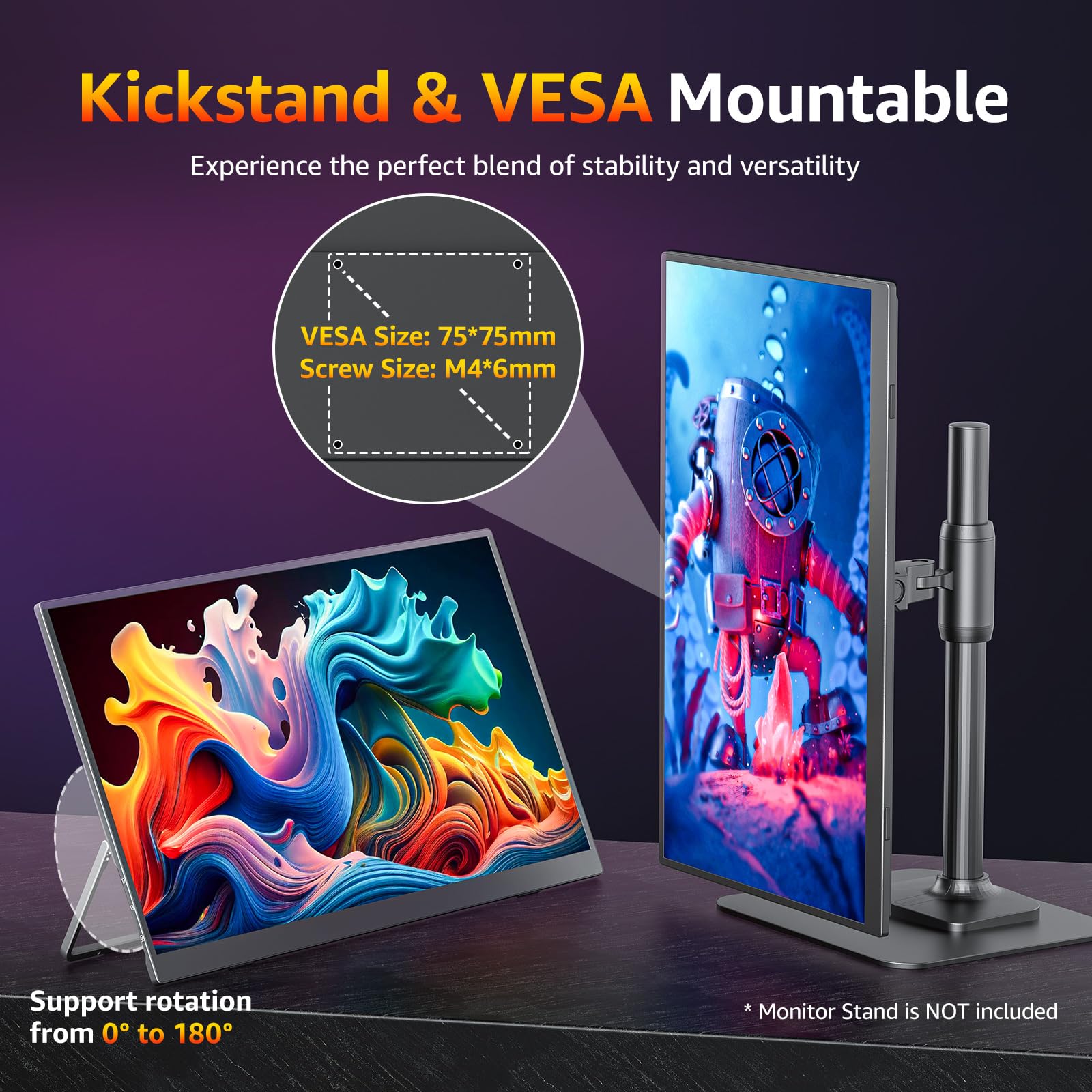 Der Monitor bietet maximale Flexibilität. Er verfügt über einen integrierten Standfuss, der sich stufenlos um 180° verstellen lässt, um immer den perfekten Blickwinkel zu finden. Für eine feste Installation ist er zudem mit VESA-Halterungen der Grösse 75x75 mm kompatibel.