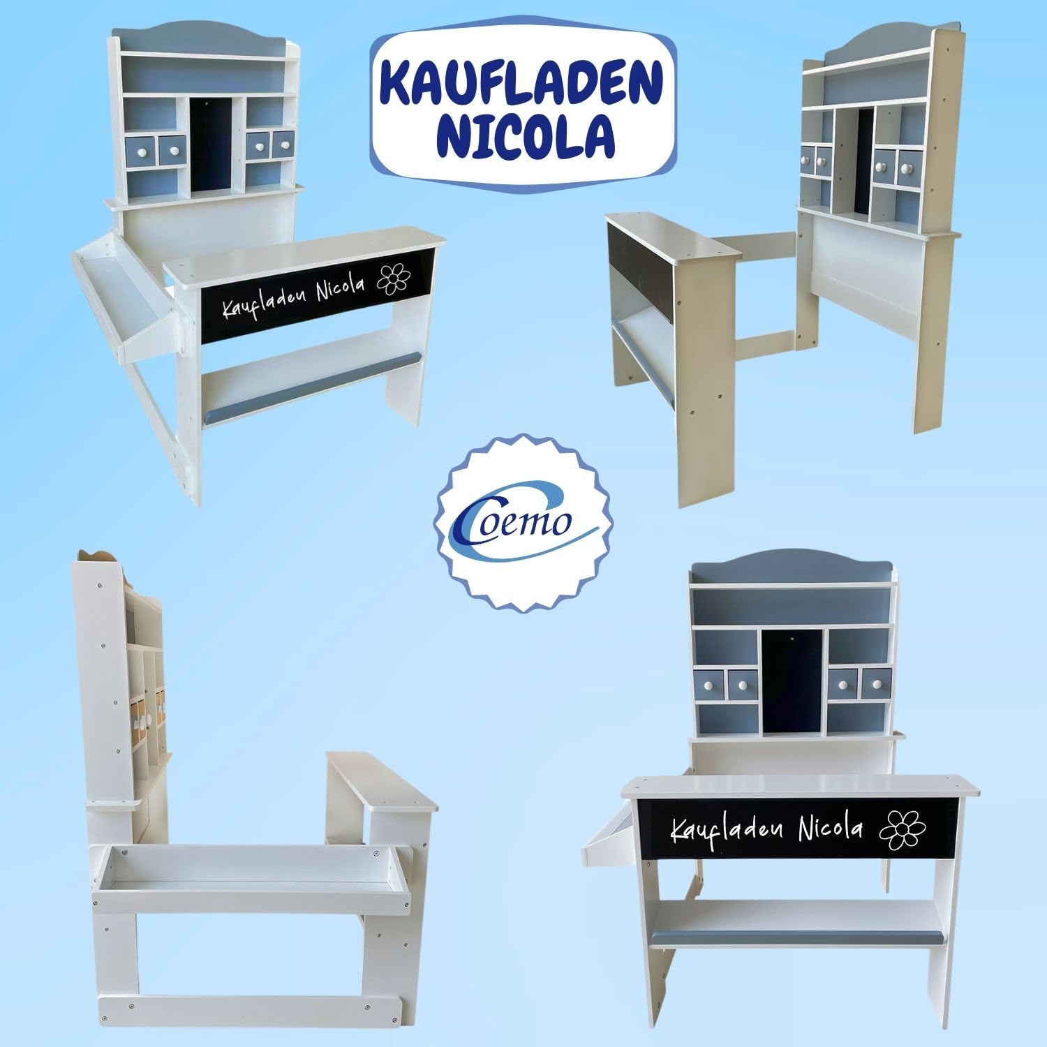 Der Coemo Kaufladen «Nicola» ist ein liebevoll gestalteter Spiel-Marktstand aus Holz, der Kinderherzen höherschlagen lässt und eine wunderbare Welt für fantasievolles Spielen eröffnet.