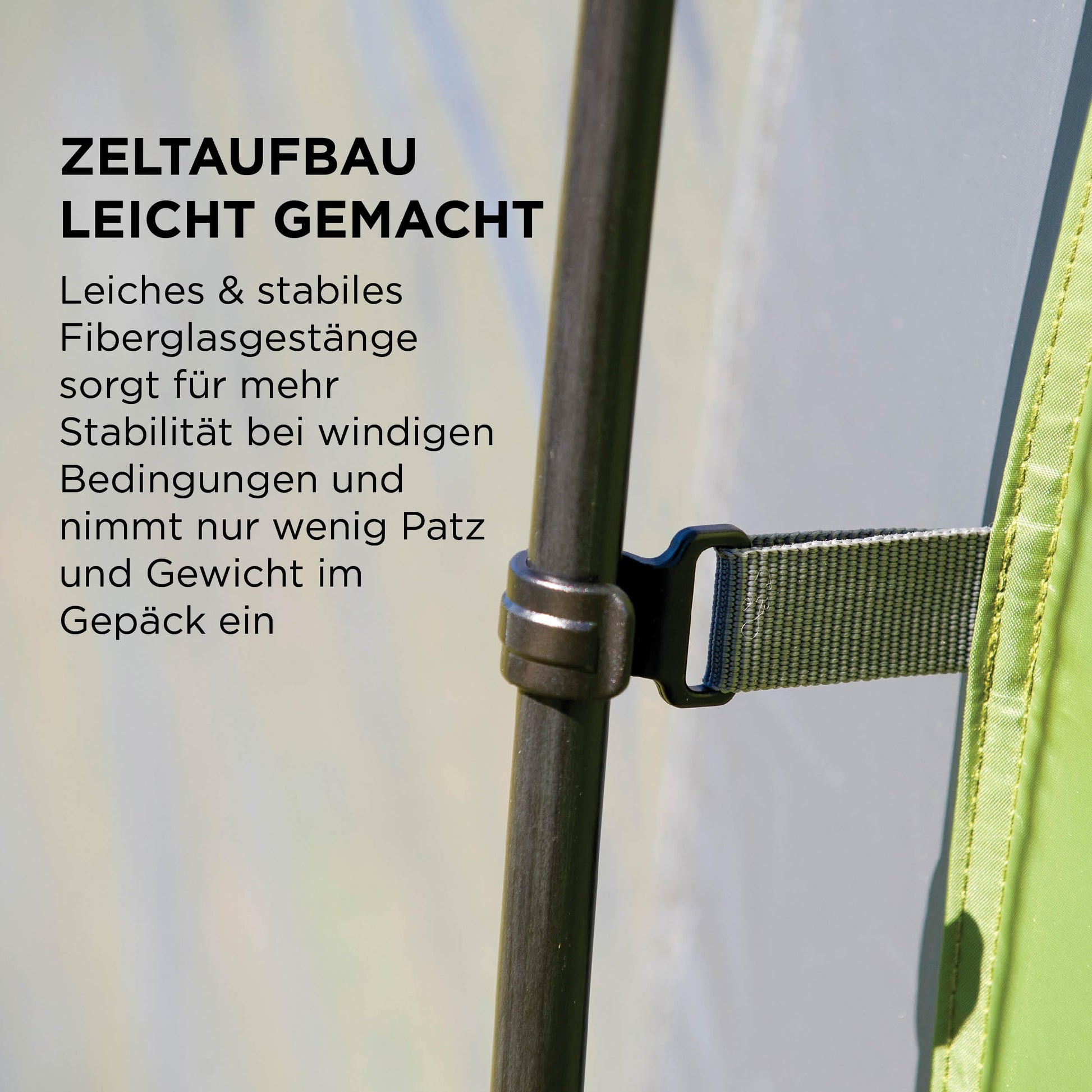 Dank der flexiblen und gleichzeitig robusten Fiberglas-Stangen sowie der aerodynamischen Tunnelform bietet das Zelt auch bei stärkerem Wind einen sicheren Stand. Der Aufbau ist unkompliziert und schnell erledigt, was es ideal für spontane Trips macht.