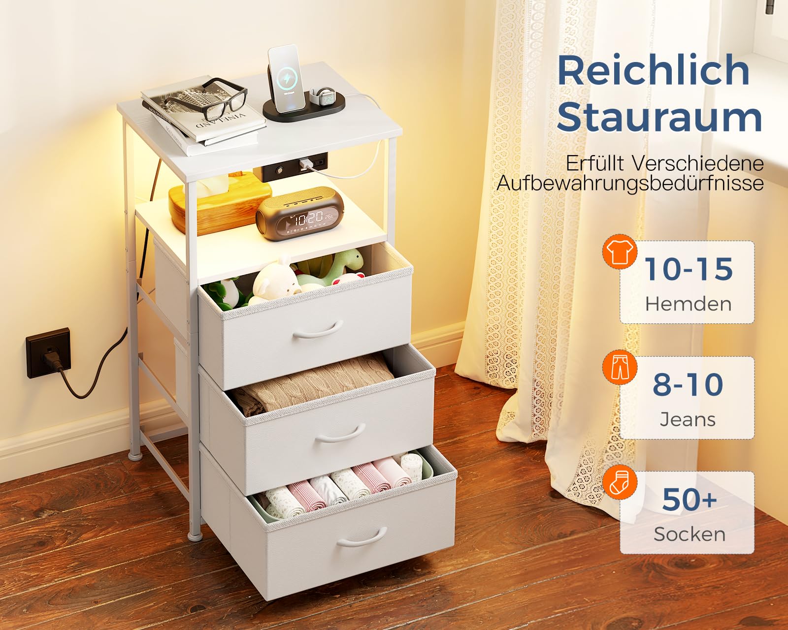 Die intelligente Aufteilung des Stauraums hilft Ihnen, Ordnung zu halten. Häufig genutzte Gegenstände wie Bücher oder der Wecker finden im offenen Fach Platz, während persönliche Dinge in den drei Stoffschubladen sichtgeschützt und leise verstaut werden können.