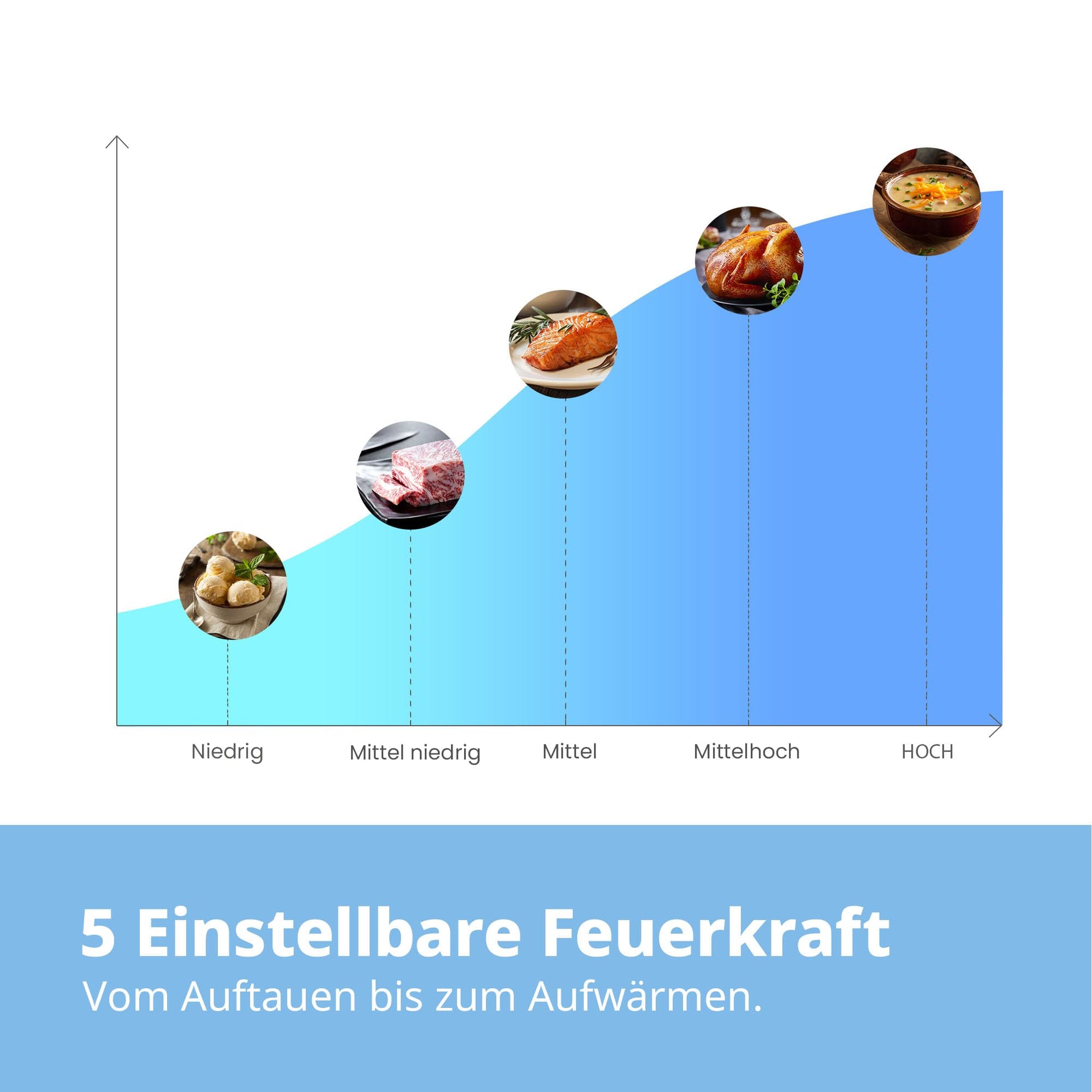 Die fünf Leistungsstufen geben Ihnen die volle Kontrolle, egal ob Sie nur kurz etwas aufwärmen, schonend auftauen oder ein Gericht vollständig garen möchten. Der grosszügige Innenraum und der Drehteller stellen sicher, dass Ihre Speisen gleichmässig erhitzt werden.