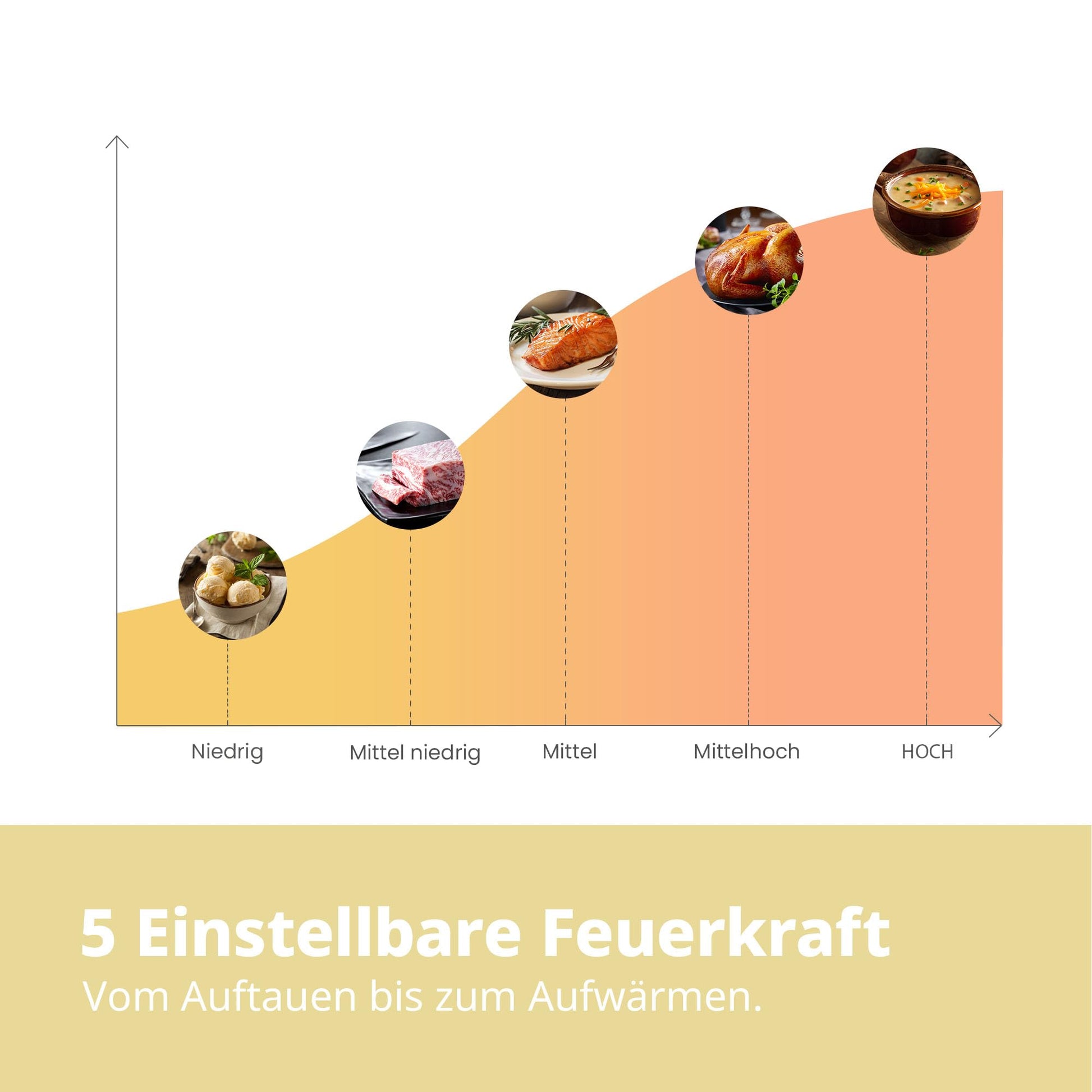 Das Gerät verfügt über 5 einstellbare Leistungsstufen bis maximal 700 Watt. Die niedrigeren Stufen eignen sich perfekt für schonendes Auftauen (easy Defrost) oder das Warmhalten von Speisen, während die höheren Stufen ideal zum schnellen Erhitzen von Getränken und Mahlzeiten sind.