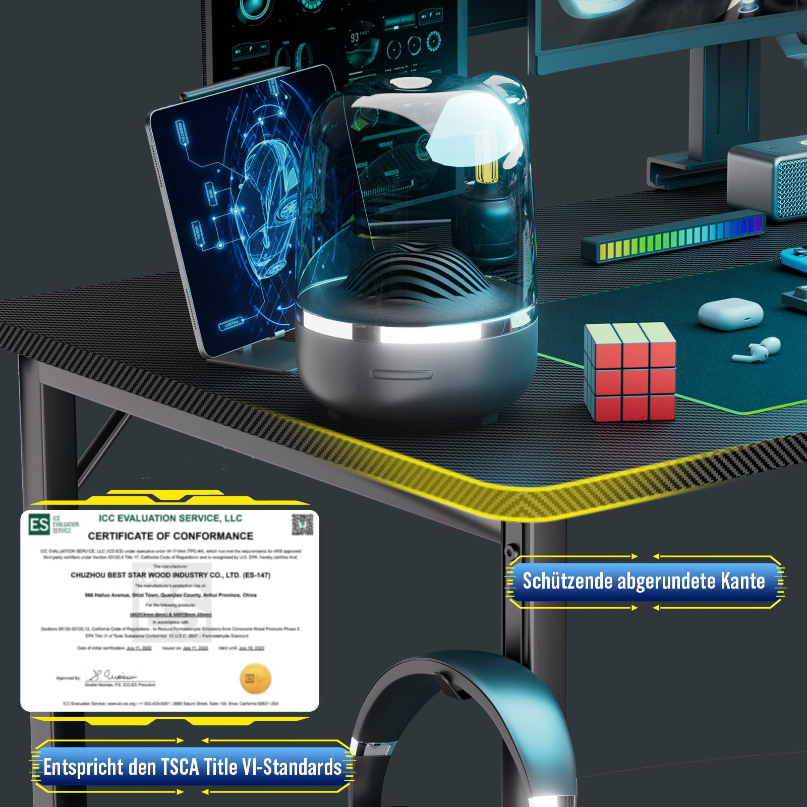 Der Schreibtisch kombiniert eine robuste Tischplatte aus kratz- und wasserfester Karbonfaser mit einem stabilen 20-mm-Stahlrahmen. Diese Konstruktion sorgt für eine hohe Standfestigkeit und Langlebigkeit, ideal für die tägliche Nutzung mit mehreren Monitoren und Gaming-Zubehör.