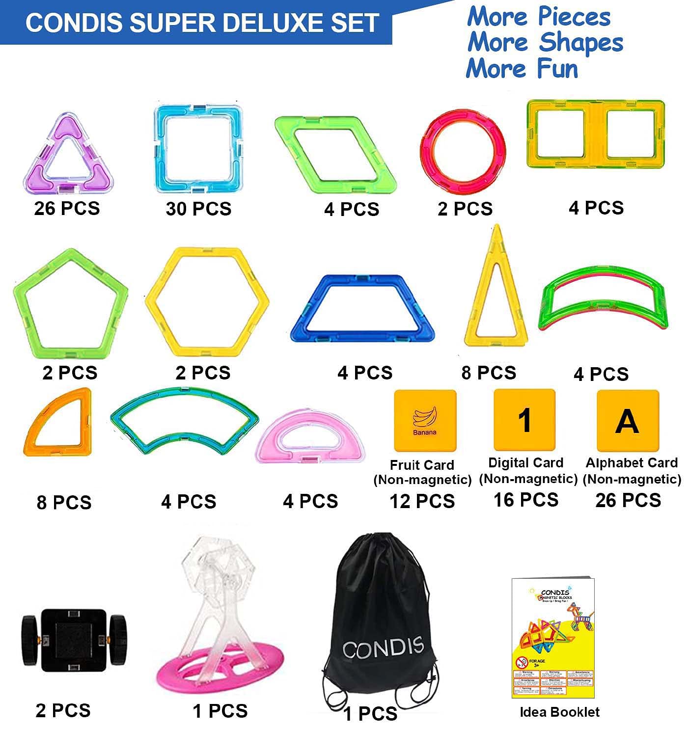 - Umfangreiches Komplettset: Beinhaltet 160 Teile, darunter eine grosse Vielfalt an magnetischen Formen, Zubehör wie Räder und ein Riesenrad sowie nicht-magnetische Lernkarten und eine praktische Tragetasche.