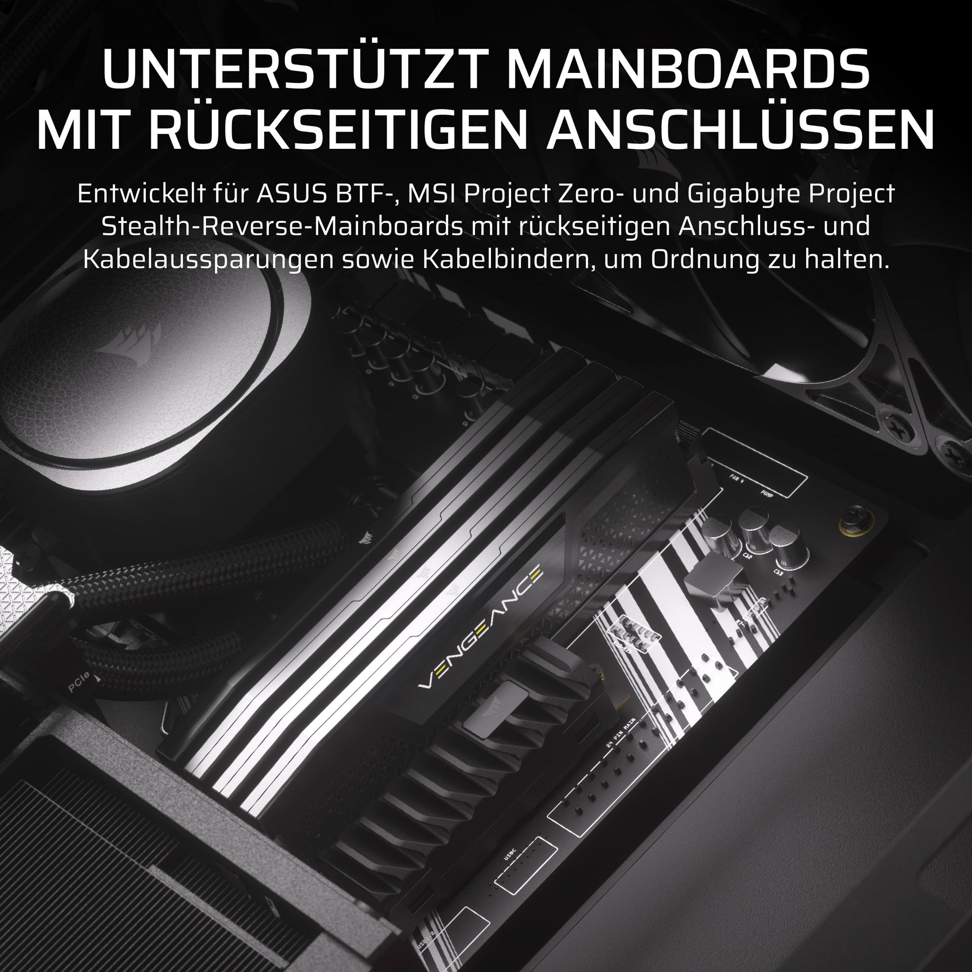 Dank seiner grosszügigen Abmessungen bietet das Gehäuse problemlos Platz für die längsten Grafikkarten und grössten Luftkühler. Es ist zudem zukunftssicher konzipiert und unterstützt moderne Mainboards mit Anschlüssen auf der Rückseite wie ASUS BTF, MSI Project Zero oder Gigabyte Project Stealth.