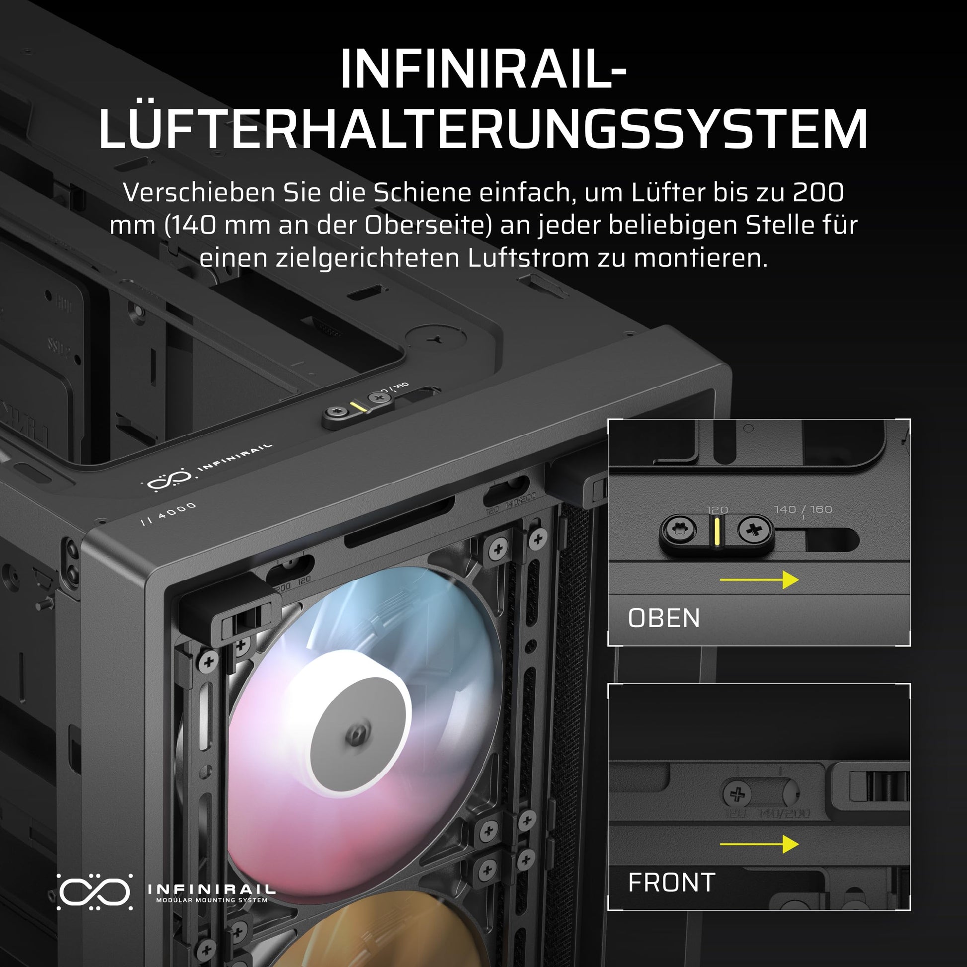 - Flexibles InfiniRail Montagesystem: Das einzigartige InfiniRail-System aus Stahl ermöglicht eine stufenlose Positionierung der Lüfter an der Front und am Gehäusedeckel. Verschieben Sie die Schienen, um Lüfter exakt dort zu platzieren, wo Sie den gezielten Luftstrom benötigen.