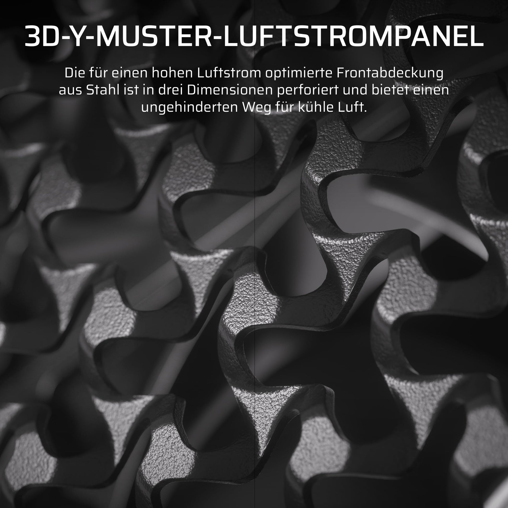 - Frontplatte mit 3D-Y-Muster: Die Frontabdeckung aus Stahl ist mit einem perforierten 3D-Y-Muster versehen. Dieses Design optimiert den Lufteinlass und minimiert den Widerstand, um eine ungehinderte Zufuhr kühler Luft zu gewährleisten.