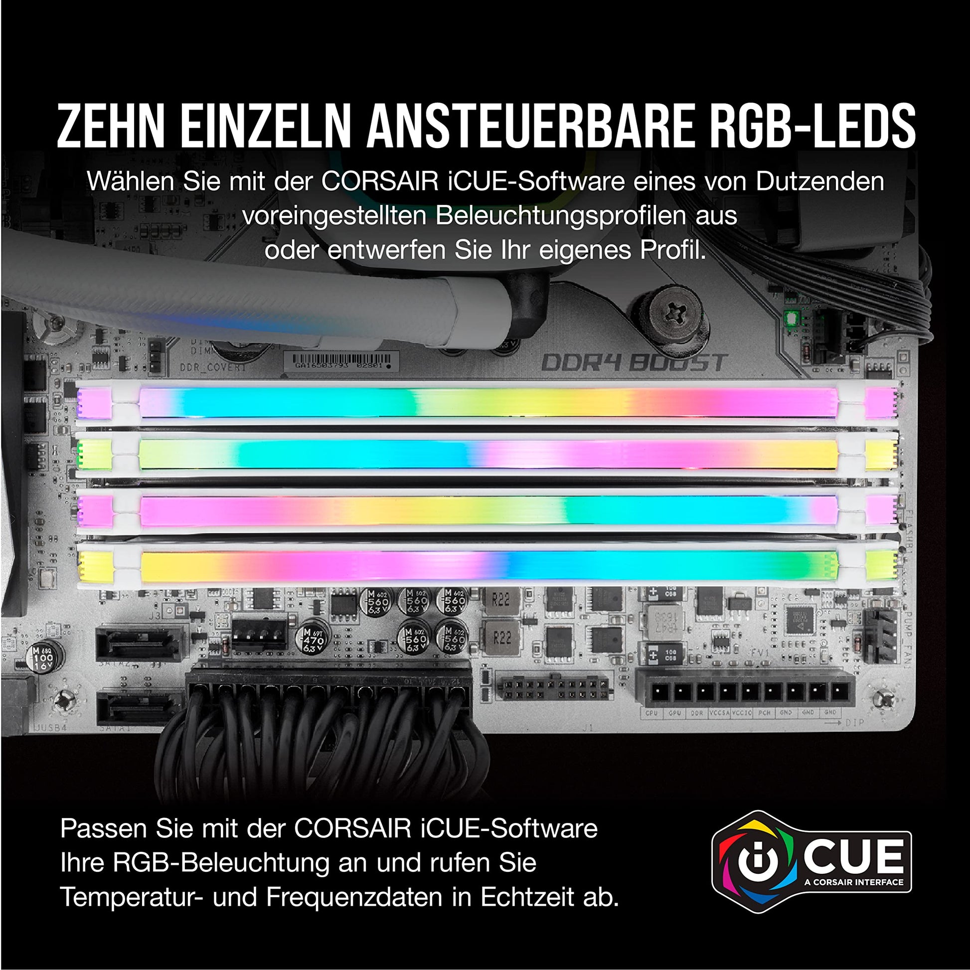- Steuern und synchronisieren Sie die Beleuchtung über die Corsair iCUE-Software. Jedes Modul verfügt über zehn individuell adressierbare, leuchtstarke RGB-LEDs, die sich nahtlos mit Ihrer weiteren Corsair RGB-Peripherie abstimmen lassen.