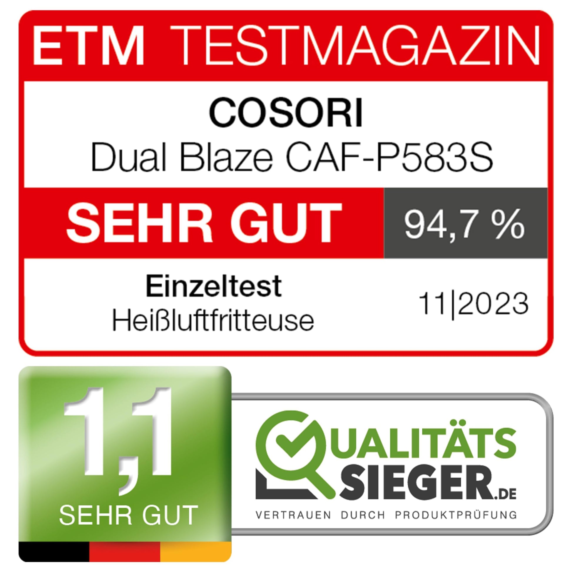 - Lieferumfang: 1x Dual Blaze Heissluftfritteuse, 1x Crisper-Platte, 1x Bedienungsanleitung, 1x Rezeptbuch